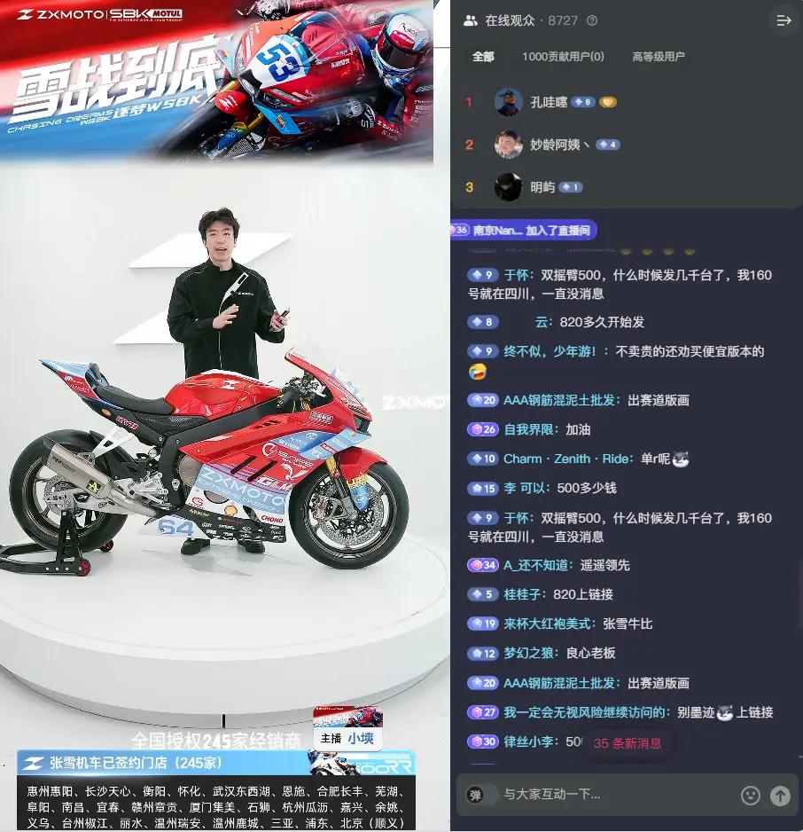 张雪机车在直播间卖爆啦,直播间里足足有9000人呢!这阵仗,简直太牛了,说是中国摩托车的骄傲一点都不为过。 张雪机车能这么火,肯定有它的道理。说不定是设计独特,造型酷炫,骑在路上回头率爆表;也可能是性能超棒,动力强劲,驾驶起来那叫一个爽。 现在国产摩托车发展得越来越好了,张雪机车就是其中的佼佼者。它在直播间的火爆,也让更多人看到了国产摩托车的实力。相信以后,会有更多像张雪机车这样的品牌崛起,让中国摩托车在世界舞台上发光发热。 张雪摩托车