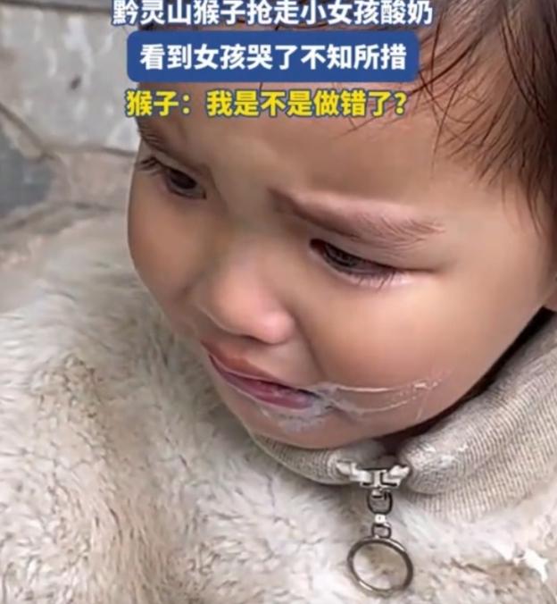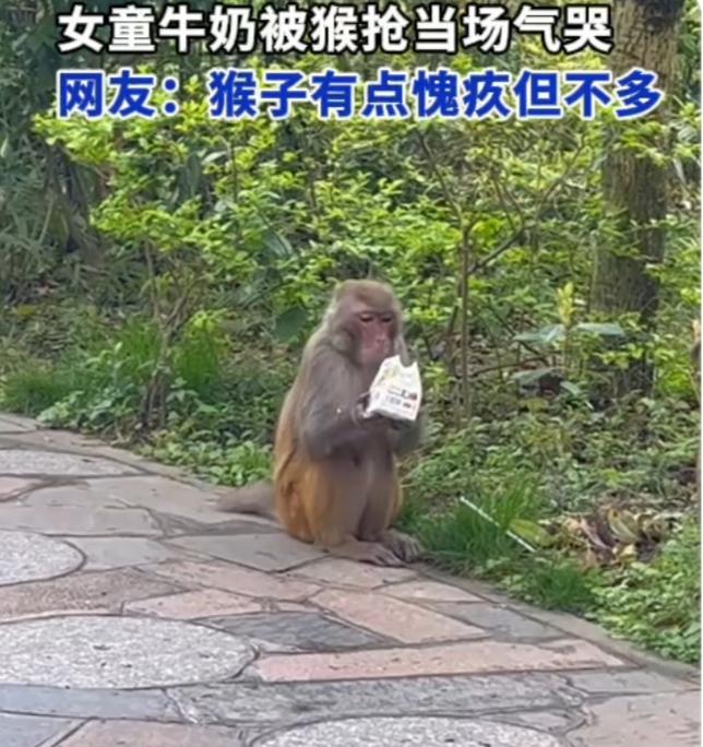 黔灵山猴子抢2岁女孩牛奶,孩子哭到发抖,网友笑喷:愧疚感仅维持3秒! 贵州黔灵山公园的一只猴子,凭一己之力火上了热搜,而它火的方式,既让人哭笑不得,又看得人心头一软。 事发当天,家长带着2岁的小女孩在公园游玩,孩子攥着一盒刚打开的牛奶,满心欢喜地准备喝,压根没留意身旁的动静。下一秒,一只猴子猛地窜出来,爪子一伸,直接把牛奶从孩子手里抢了过去,动作快得让人来不及反应。 小女孩当场就懵了,攥着空落落的小手,愣了两秒后,满心的委屈和生气瞬间爆发,小嘴一瘪,眼泪哗哗往下掉,站在原地哇哇大哭,小身子都跟着轻轻颤抖。那又怕又气的小模样,隔着屏幕都让人觉得心疼。 更绝的是这只猴子的反应,它抱着抢来的牛奶,没着急跑远,就站在离孩子不远的地方,歪着头看着哭唧唧的小女孩。网友们精准戳中笑点:猴子脸上居然露出了一丝愧疚,仿佛在说“我是不是有点过分了”,可这份愧疚,也就仅仅维持了几秒,转头就抱着牛奶美滋滋地喝了起来,半点没有要还回去的意思。 不少网友看完纷纷调侃:“这猴子主打一个知错就改,但改不改再说”“像极了犯错后有点心虚,但绝不认错的小朋友”“心疼小女孩,又忍不住笑出了声”。 其实黔灵山的猴子向来不怕人,偶尔会抢游客食物早已不是新鲜事,但这次偏偏因为这丝“微不足道的愧疚”,戳中了无数人的笑点和心软的瞬间。小孩子的世界很纯粹,一盒牛奶就是全部的快乐,被抢走后的委屈直白又真实;而猴子的反应,更是把动物的天真与狡黠展现得淋漓尽致。 不过笑过之后也想提醒大家,带孩子去景区游玩,遇到野生动物一定要保持距离,看好孩子和随身物品,别让可爱的偶遇变成小惊吓。黔灵山看猴 黔灵山猴群
