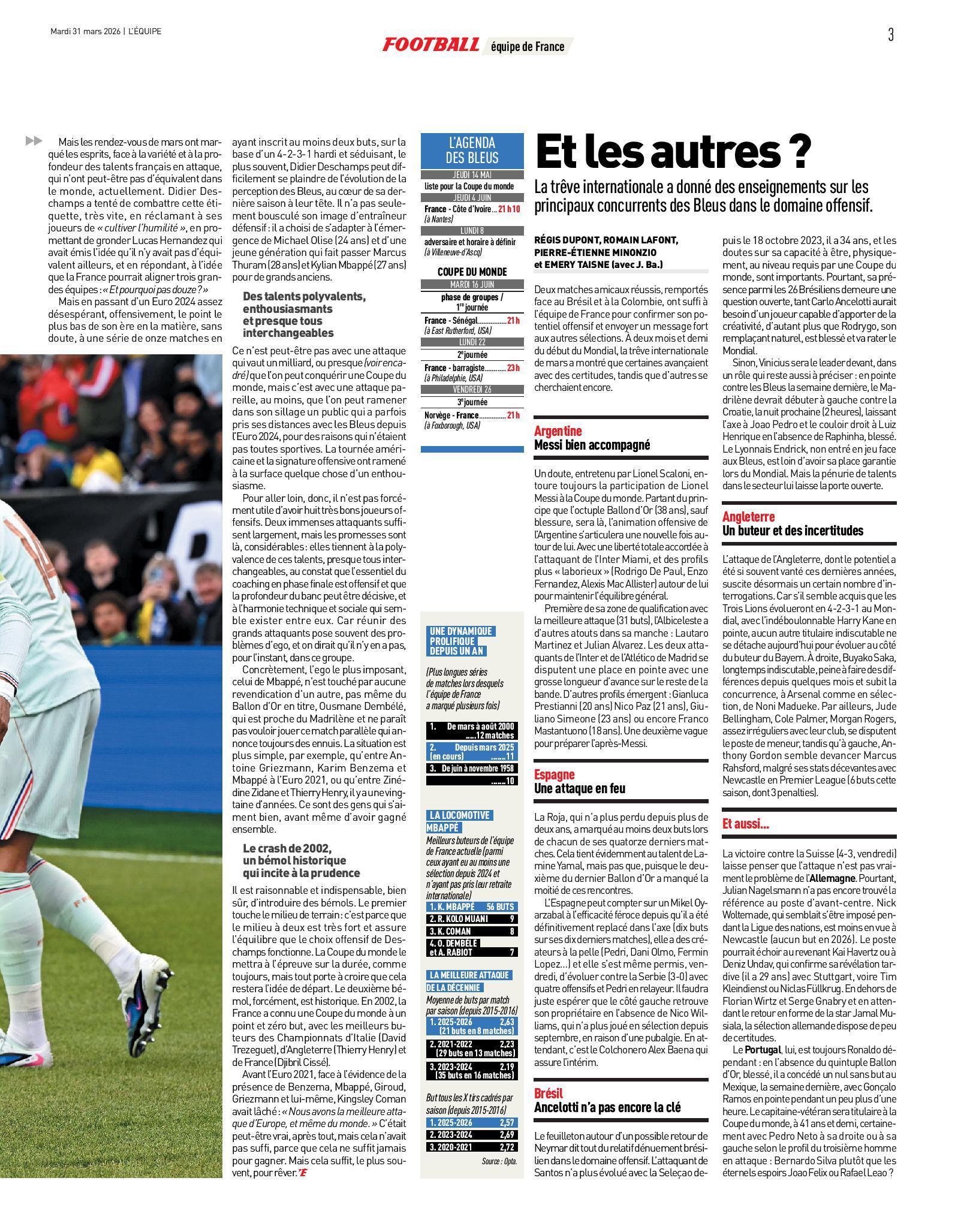 但让我们回到现实:法国队的天赋与进攻多样性,确实是世界足坛其他球队难以企及的。迪迪埃・德尚本人也多次强调,他 “渴望培养能在不同位置发挥作用、能适应多种战术的球员”,并一直努力打造一支能在高水平比赛中保持稳定的队伍。2024 年欧洲杯进攻乏力的阴霾仍在,但在最近一系列比赛中,法国队的进攻火力已毋庸置疑。