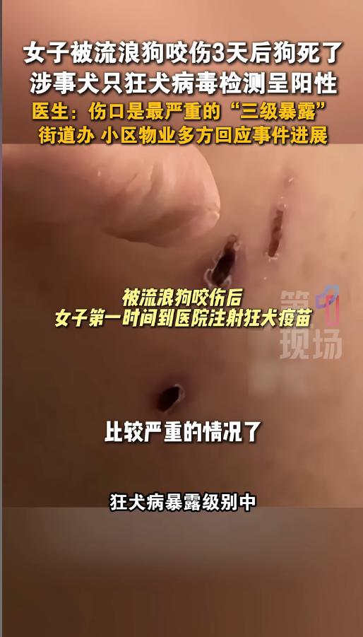 “细思极恐!”近日,河南焦作,一女子在家中,被尾随而来的一只流浪犬咬伤了腿,造成了非常严重的贯穿伤。女子非常害怕,当即去了医院,流浪狗也被物业带走了。三天后,流浪狗死了,狂犬病检测为阳性,这让她更害怕了!网友:流浪狗该整治了! 养个宠物并不是什么坏事,不仅能排解心情,甚至对健康还有好处。可有些人,养着养着就抛弃了,宠物没了主人,四下流浪,就成了一个危险因素。 据媒体报道,事发当日,该女子正在家中,家里的门半开着。突然间,一只流浪狗尾随而至,窜了进来。女子害怕狗狗伤到孩子,就上前驱赶,没想到狗扑上来,对着自己的腿狠狠地就是一口。 女子不敢大意,当即去了医院,流浪狗也被物业抓走。医院检查显示,女子的伤口三级暴露,属于狂犬病暴露级别中最严重的,需要立即进行处理。 更让她难过的还在后面,三天后,被物业抓走的流浪狗就死了,狂犬病检测显示为阳性。女子听到这个消息,十分担心自己的身体健康。虽然自己已经按要求完成了狂犬疫苗及免疫球蛋白的接种,但仍然不敢大意,在医院接受了观察。 网友看后表示,责任和赔偿暂且不论,得好好反思一下,为什么会发生这种情况。针对流浪猫狗的问题,当地政府和物业应该怎么办,才能将安全风险降到最低?毕竟成年人可能只需要打个针,可要是受伤的是孩子呢?有可能性命难保! 信息来源:《女子被流浪狗咬伤3天后狗死了,涉事犬只狂犬病毒检测呈阳性,街道办、小区物业多方回应事件进展。(3月27日发布,河南焦作)》第一现场