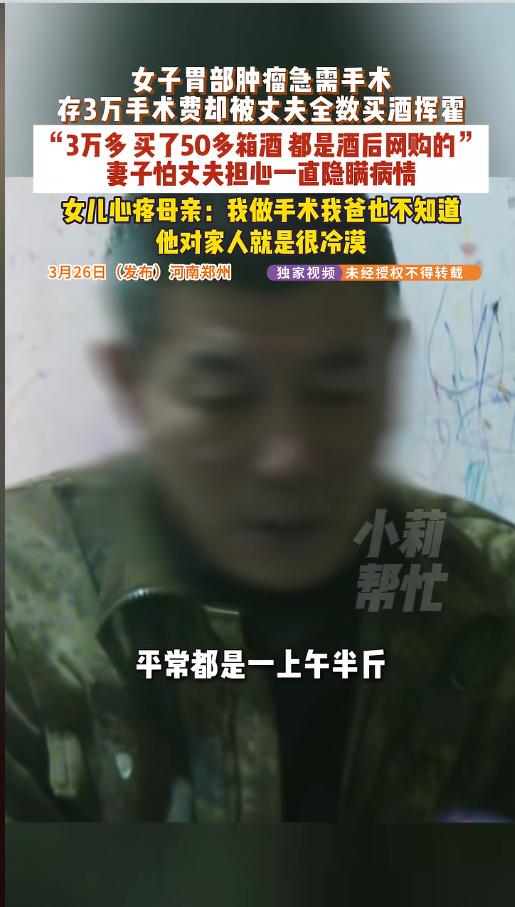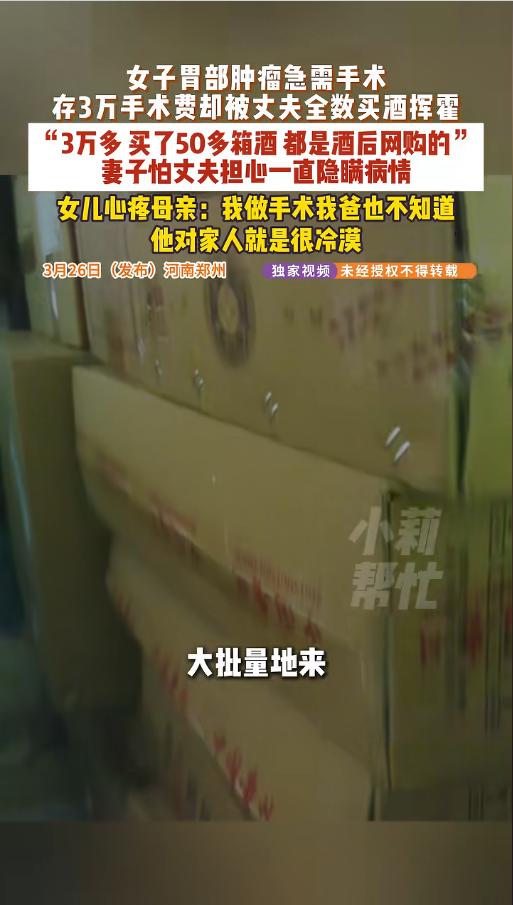“酒蒙子!”近日,河南郑州,一女子正准备做手术,却发现自己攒的三万元手术费不翼而飞了,家里还多出来不少酒。仔细一问,这些钱竟被丈夫酒后挥霍一空,全部在网上买酒了。平时丈夫上午半斤,下午半斤,连妻子做手术都不知道! 有人说,酒是粮食精,越喝越年轻,可这因为喝酒,闹出来的事儿真不少。酒驾的,打人的,耍酒疯的,猝死的,简直是应有尽有。种种迹象都证明了,酒,是真的不能多喝。 本来,该女子都约好了手术,去拿自己存的手术费时,却突然发现,没有了!同时,女子还发现,自己家里收到了不少酒。一问才知道,前几天丈夫喝完酒后,把这些钱给挥霍掉了,全部买了酒,一共五十多箱,还有三十多箱搁路上呢,到了的也还没开封呢。 记者也询问了她丈夫,他竟然声称,自己不知道妻子要做手术,也不知道这是攒的手术钱。提起喝酒这事,他说自己现在上午半斤,下午半斤,还又埋怨起妻子来。他说都是以前干活的时候累,妻子让他喝酒缓解,这才养成了这个坏毛病! 好在经过协调,他们也跟厂家达成了一致,由女子的丈夫负责运费,将全部的酒给退回去,对方给安排退款。丈夫也跟妻子认了错,并承诺以后慢慢戒掉这个坏毛病。 本来应该是个好家庭,现在却因为酗酒闹得鸡飞狗跳。整天用酒精麻痹自我,完全沦为了酒的奴隶,家庭、生活、人生都整的一团糟。没有自控力的人,还是不要喝酒了。酒,也并不是一个好东西! 信息来源:《3月26日(发布)河南郑州,女子胃部肿瘤急需手术,存3万手术费却被丈夫全数买酒挥霍 。“3万多 买了50多箱酒 都是酒后网购的”妻子怕丈夫担心一直隐瞒病情 ,女儿心疼母亲:我做手术我爸也不知道,他对家人就是很冷漠。》小莉帮忙