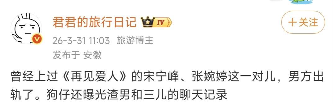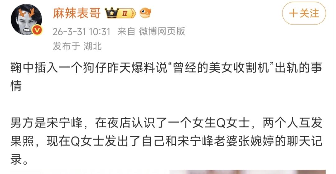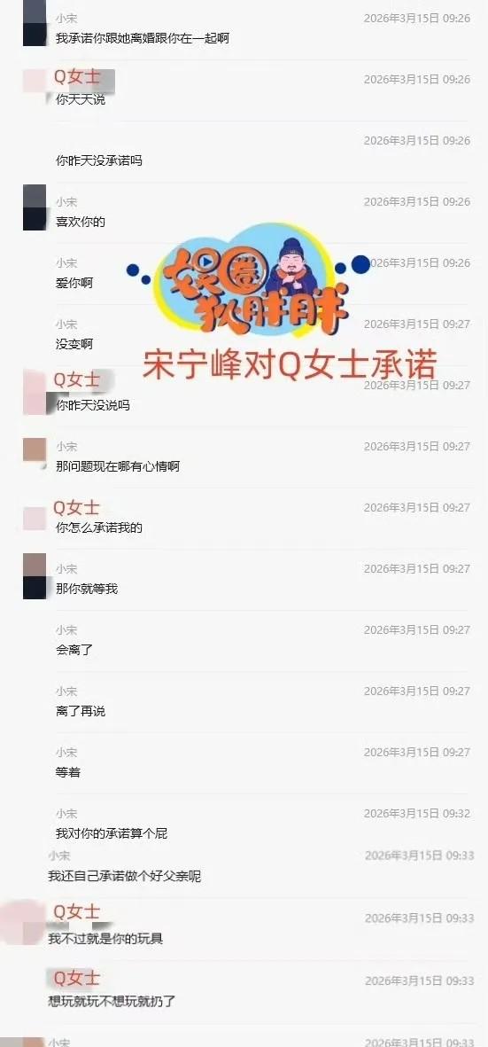 离谱!宋宁峰出轨塌房,还连累齐溪被扯进来 刚凭《老舅》翻红的宋宁峰,戏外彻底翻车了! 被狗仔曝婚内出轨,连聊天记录都被扒光,这到底是怎么回事? 这事最早是狗仔爆的,说这位“曾经的美女收割机”宋宁峰,在夜店认识了Q女士,俩人发展不正当关系还互发裸照,现在女方直接放出了和他老婆张婉婷的聊天记录,锤得死死的。 宋宁峰是齐溪的前夫,离婚后和经纪人张婉婷认识一个月就奉子成婚,俩人不光上过《再见爱人2》,前不久还登了《再见爱人5》,不少人都以为他俩关系早就缓和了。 结果没想到,表面上的婚姻安稳,背地里却是男方一边哄着老婆,一边用“会离婚”的借口骗女方感情。 更让人无语的是,齐溪现在和王传君过得好好的,就因为是宋宁峰前妻,平白无故被这场风波牵连,纯纯无妄之灾。 事件后续更是离谱,事情败露后宋宁峰先让女方帮他圆谎,转头就翻脸不认人,说“承诺算个屁”;张婉婷更是直接发信息威胁女方,扬言要发她裸照给家人。 最后女方不堪其扰,才把所有事都爆了出来。 只能说娱乐圈的人设真的太易碎了,戏里演着仗义大哥,戏外却干着没担当的事,刚翻红就把路人缘败光了。 婚内出轨本就是底线,自己犯的错自己担,别再连累不相干的人了。 你们觉得这事离谱吗?前夫塌房该不该带上前妻一家?