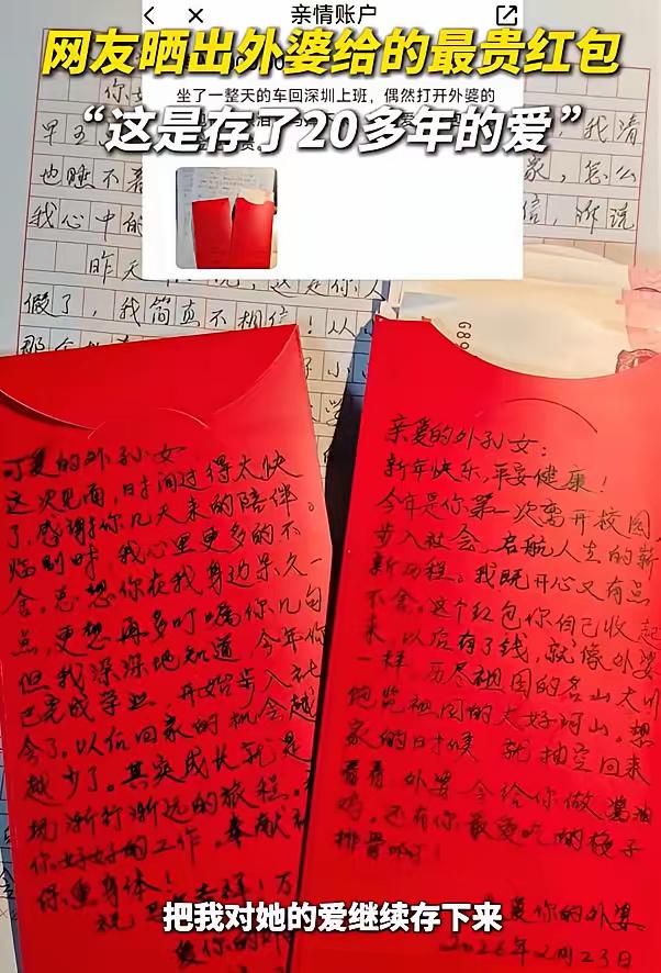看哭了!广东,女子节后返工到家收拾行李时,突然在包里发现两个红包,信上密密麻麻写满了字,而红包拆开后发现里面除了钱,还有一张外婆的手写信,女子看到信上的内容,瞬间落泪:“我收到了人生中最贵的红包”。 节后返工的疲惫,相信很多在外打拼的人都懂。匆匆告别家人,拖着装满行李的箱子奔赴工作地,到家的第一件事,大多是瘫坐下来歇一歇,再慢慢收拾行李。 广东有位雷女士,就是这样,可她收拾行李时的一个意外发现,让原本疲惫的自己,瞬间红了眼眶,事情很简单,雷女士节后返工回到广东的家,傍晚时分,她拉开包的夹层,突然摸到两个鼓鼓囊囊的东西,拿出来一看,是两个红包。 一开始她还愣了一下,心想自己临走前明明没收外婆的红包,怎么会出现在包里, 她带着疑惑拆开第一个红包,里面是一叠现金,有崭新的红票子,也有皱巴巴的旧钞,看得出来,这些钱不是一下子凑齐的,更像是一点点攒下来的。 紧接着,她拆开第二个红包,里面没有钱,只有一张叠得整整齐齐的信纸,上面密密麻麻写满了外婆的字迹,没有华丽的辞藻,全是最朴实的家常。 信上写着,想家的时候就抽空回来看看,外婆给你做酱油鸡,还有你最爱吃的梅子排骨,就是这样简单的一句话,让雷女士瞬间破防,眼泪啪嗒啪嗒地掉了下来。 她后来坦言,自己从小就是被外婆带大的,小时候外婆就说过,过年给她的红包会帮她存起来,她当时没太在意,没想到,外婆真的记在了心里,这一存,就是二十多年。 雷女士说,这是她收到过人生中最贵的红包,说白了,这个红包贵的从来不是里面的钱,而是外婆二十多年的牵挂和疼爱。 老人家不善于表达,不会说太多暖心的话,却把所有的爱,都藏在了这两个偷偷塞进去的红包里,藏在这封手写的信里,其实不难想象,外婆应该是在雷女士收拾行李忙着告别的时候,趁着她不注意,悄悄把红包塞进了她的包里。 她怕雷女士不好意思收下,怕孩子在外打拼受委屈,怕孩子想家却不好意思说,所以才用这样笨拙又真诚的方式,表达自己的牵挂。 雷女士还说,她一直悄悄把外婆给的红包存在亲情账户里,就是想把外婆对她的爱,一直存下去,现在我们大多习惯用手机发消息、发红包,很少有人再手写书信,可外婆的这封信,比任何电子消息都动人,比任何贵重的礼物都珍贵。 这件事之所以让人看哭,不是因为有多惊天动地,而是因为它太真实、太戳心,我们每个人的身边,或许都有这样一位默默爱着我们的长辈,他们不善言辞,却用行动把所有的温柔都给了我们。 在外打拼的我们,总忙着追逐梦想忙着赚钱,却常常忽略了家里长辈的牵挂,愿我们都能读懂长辈的心意,抽时间多回家看看,别让忙碌冲淡了亲情,别让牵挂变成了遗憾,毕竟,这份藏在细节里的爱,才是我们在外打拼最坚实的底气。
