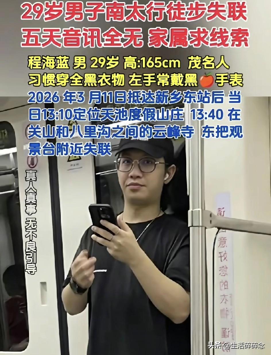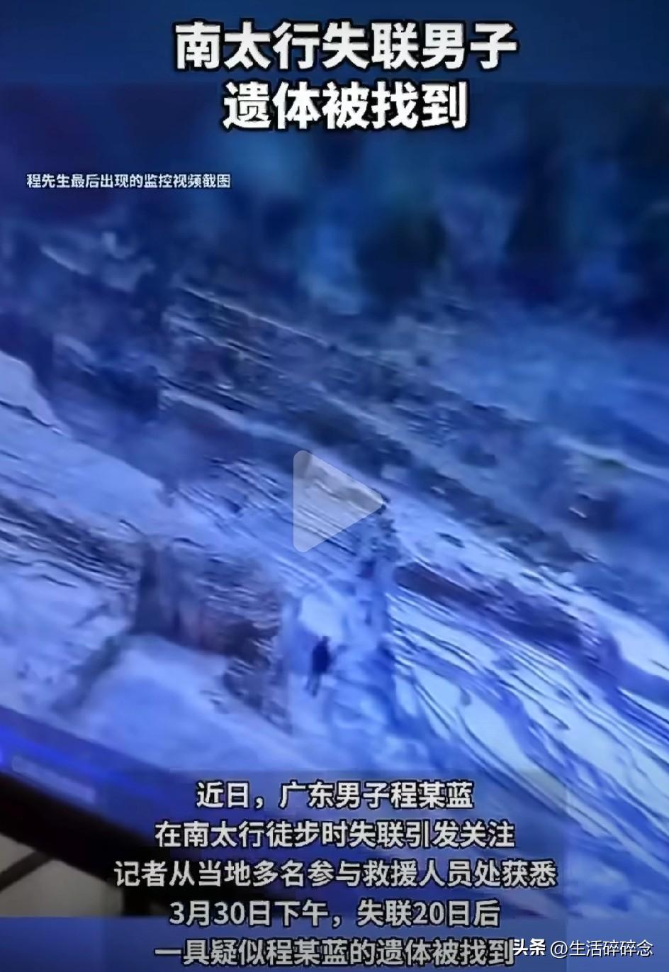 太遗憾!在南太行失联20多天的29岁广东男子程某蓝遗体于3月30日被救援人员找到了。 据救援人员透露,遗体是在老龙口瀑布对面观景台下方七八十米的悬崖下发现的,位置极其隐蔽,属于没人走的野路线。现场环境复杂,遗体转运难度极大,家属已经到现场确认了身份。 监控显示,程某蓝最后出现的时间是3月11日下午2点45分,地点就在老龙口瀑布附近,之后便彻底失联。他身穿一身黑衣,独自进山,手机最后定位停留在关山和八里沟之间,没有专业装备,也没有结伴同行,一个人走进了这片看似风景绝美,实则暗藏杀机的山野。 很多人可能不知道,南太行近几年早已经不是单纯的徒步圣地,而是事故频发的“高危区域”,几乎每年都有年轻生命在这里遇难。 就在去年10月,同样是29岁的河南男子饶某辉,只带了一瓶水、穿着皮鞋就独自闯南太行野线,迷路后失联43天,最终遗体在悬崖下的岩缝中被找到。 今年3月初,一名女驴友在张沟天梯废弃野线徒步时,因雪后路滑失足坠崖,当场遇难,同一天还有20多名驴友被困山中 。 老龙口瀑布、张沟天梯、抱犊村野线……这些网红打卡点,全是南太行的“夺命路段”。一侧是百米悬崖,没有任何护栏,路面常年湿滑长苔藓,稍微分心就可能踩空滑坠。 更让人后怕的是,这些野线大多还没有开发,手机没信号,一旦出事,救援难如登天。这次搜救程某蓝,前后出动近200人,排查了悬崖、密林、深潭,耗时20天才找到。 很多人觉得徒步是放松,是挑战自我,却忘了大自然从不会手下留情。年轻不是资本,独行更不是勇气,没有万全准备、不了解地形就贸然进山,赌的就是自己的命。 一条野线,多条人命,南太行的风景再美,也不值得用生命去换。愿逝者安息,也希望所有户外爱好者都能敬畏自然,平安出行。
