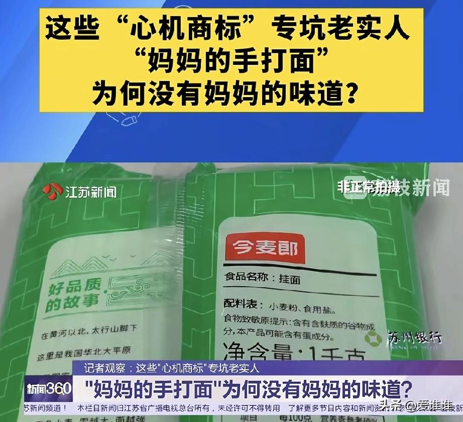 男子超市买“手打挂面”,却没有吃出和平常的挂面有什么区别,于是询问厂家客服,客服回应:“手打”是商标,并非生产工艺。也就是说这就是平常的挂面! 2026年3月,南京的陈先生到超市买面条,想着吃一碗热乎饭,货架上一款“手打挂面”吸引了他,包装上“手打挂面”四个字特别显眼,旁边还写着“好像妈妈的手打面”,看着就让人想起家里做的面,他以为是手工做的,没多想就买回去了。 结果煮好一尝,口感跟手工面差得远,硬邦邦的,他翻过包装仔细看,才发现“手打”两个字右上角有个小小的®标志,这竟然是注册商标,不是指做法,今麦郎公司的人回应也很直接:面是在车间里做的,“手打”就是取的名字。 男子觉得被套路了,明明冲着“手打”去的,结果只是个牌子。 其实像这样的“文字游戏”市面上还有不少,比如有款“一品牛肉干”,包装上“一品牛”三个字特别大,看着像牛肉做的,可配料表里只有猪肉,原来“时尚美味一品牛”才是商标,“肉干”是品名,连起来就让人误会。 还有“树上采的椰子水”,让人以为椰子刚从树上摘下来就灌装,实际上“树上采的”是个正在申请的商标,同一家公司还注册了“猴子摘的”“森林中的”这类名字。 更离谱的是“富硒虫草蛋”,客服解释说鸡蛋跟冬虫夏草没关系,只是鸡吃虫子和草下的蛋。 这类通过排版把商标和商品名混在一起,误导消费者对原料、工艺产生错误认识的做法,已经涉嫌虚假宣传,希望能重点整治。 对于消费者来说,陈先生的经历也算提了个醒:买东西不能光看包装上显眼的大字,得多翻到背面看看配料表,再留意一下那些不起眼的®或™标志。毕竟再怎么玩文字游戏,配料表上写的才是真话!