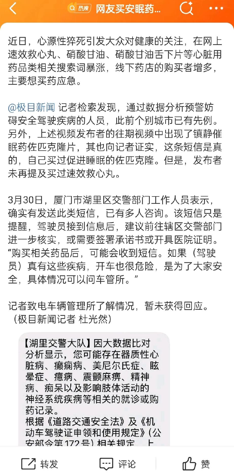 网友买安眠药后收到注销驾驶证短信。说个人隐私,你说为了交通安全,我同意的。但同时