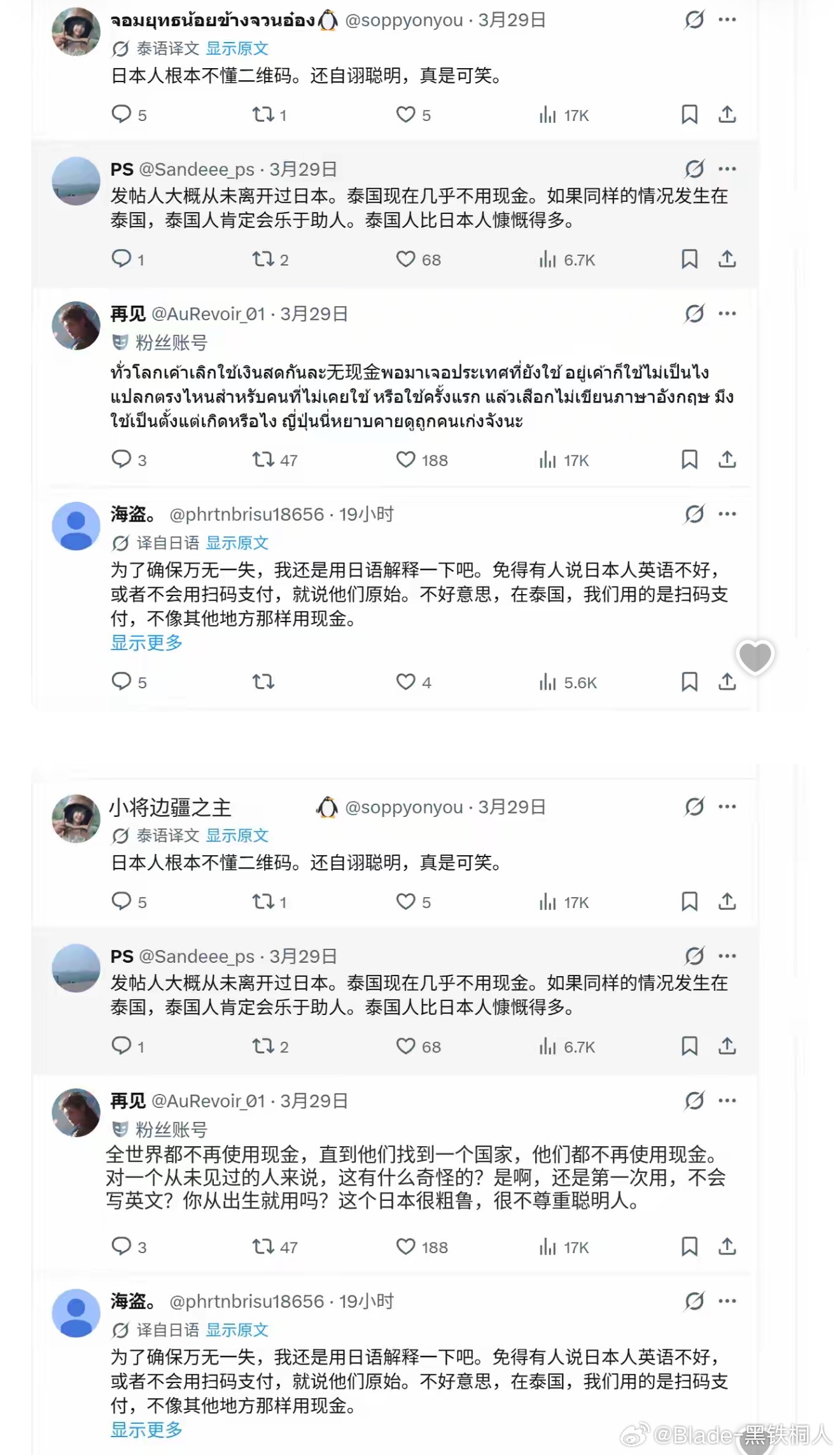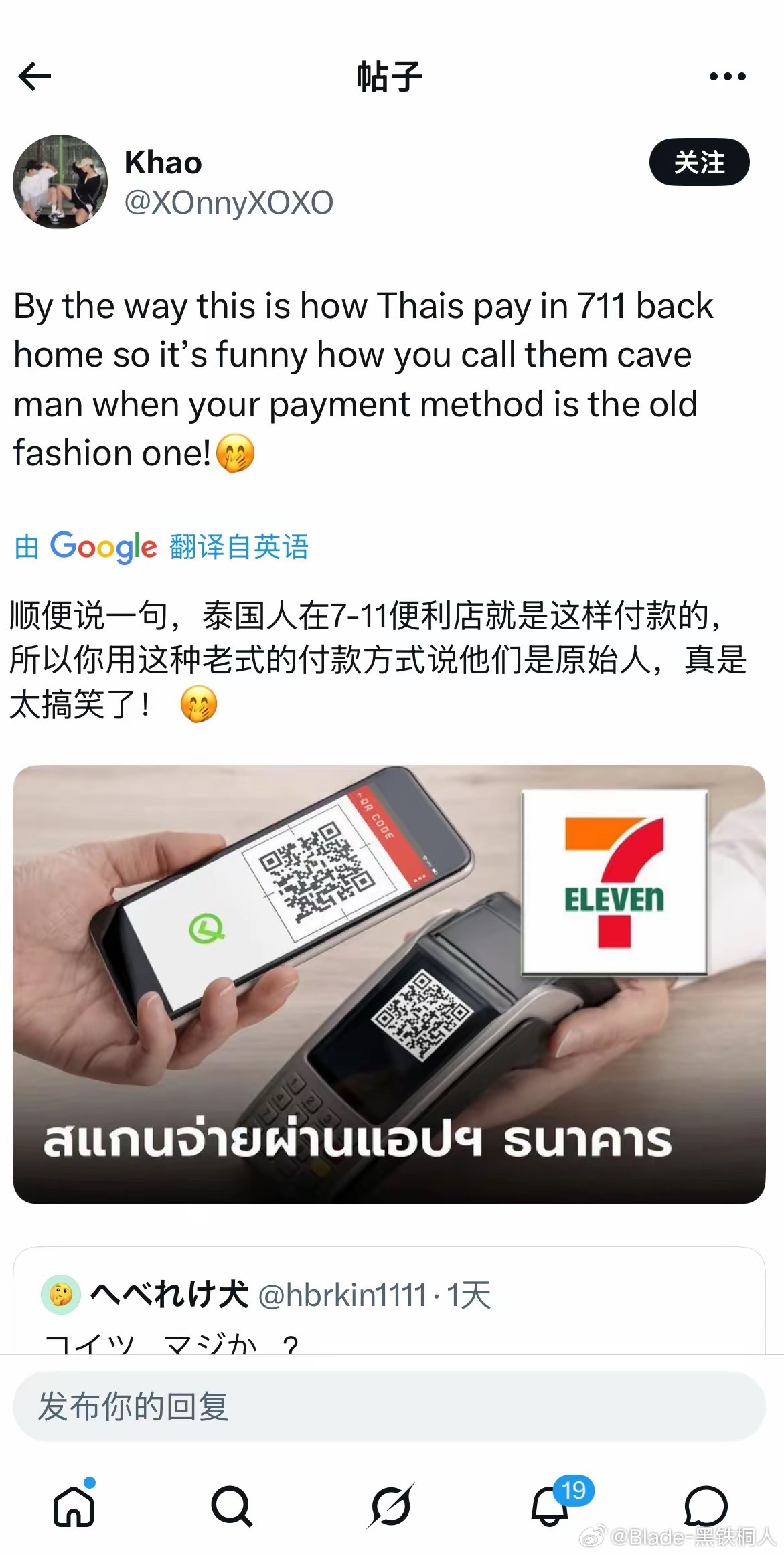相对于日本和泰国的体量而言这件事的流量已经不算小了,秀优秀后就被泰国网友给冲了,网友纷纷发二维码支付截图嘲讽日本“原始人嘲笑现代人不会钻木取火”。