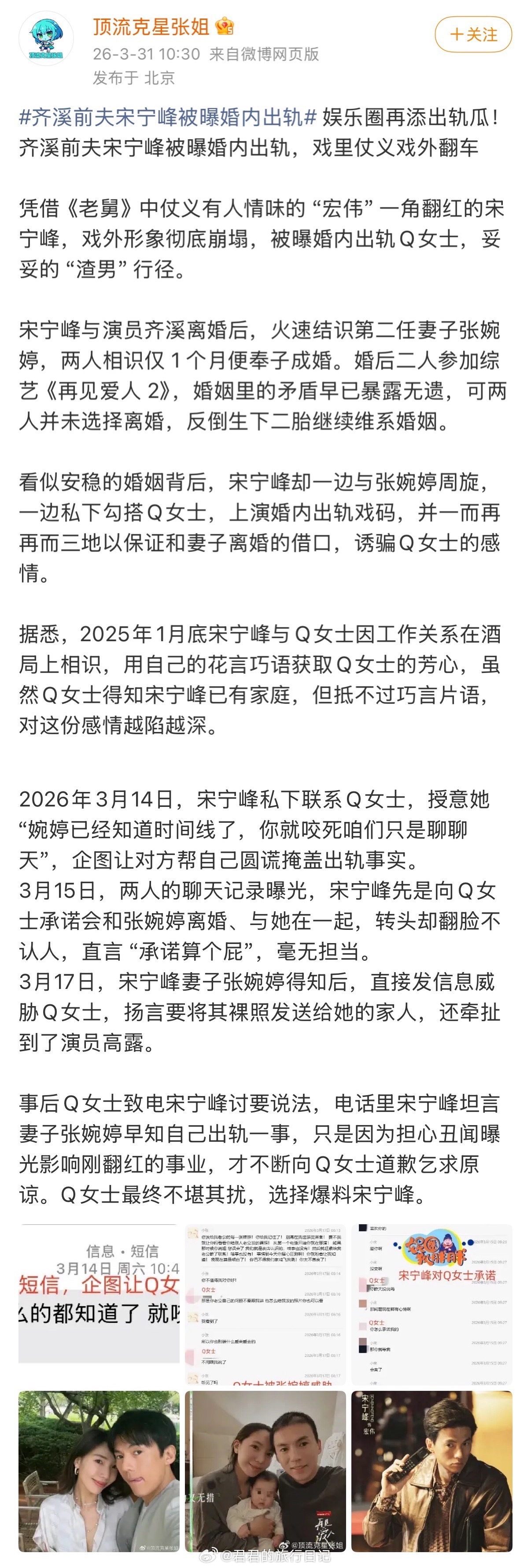 曾经上过《再见爱人》的宋宁峰、张婉婷这一对儿,男方出轨了。狗仔还曝光渣男和三儿的聊天记录