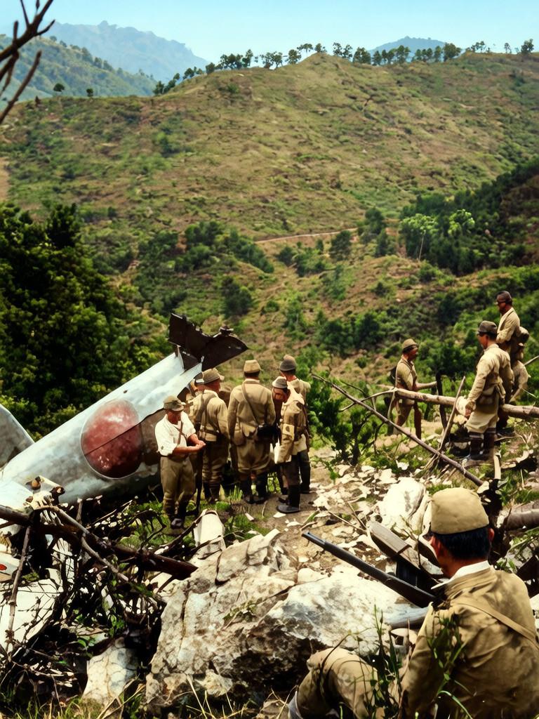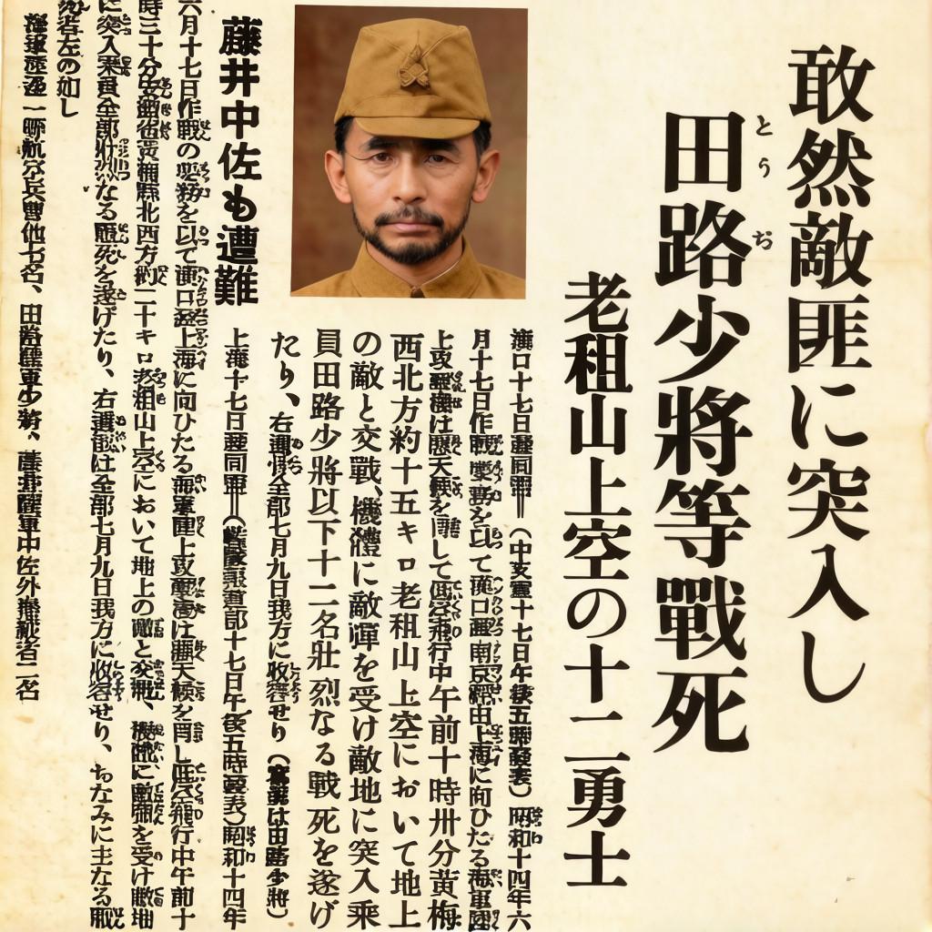 1939年6月17日,侵华日军将领田路朝一少将、藤井中佐等12人,乘坐一架九六式陆上攻击机从武汉飞往南京。在途经湖北黄梅县赛老祖山上空时,被当地的新四军江北游击第八大队的地面火力击中坠毁,机上人员全部丧生。这张照片是7月19日,侵华日军派出的搜索队到达坠机现场时所拍摄。 田路朝一是抗日战争期间被中国军队击落毙命的日军现役将官。其死亡时间早于著名的日军“名将之花”阿部规秀(1939年11月被击毙)。 由于新四军江北游击第八大队在随后争夺飞机残骸的战斗中,遭受进攻黄梅县的日军与驻防县城的国民党桂军(第172师) 双重夹击,几乎全军覆没,没能及时向新四军军部上报击落敌机的战果。此战功竟被国民党桂军第172师师长程树芬冒领,他因此获得了“嘉奖”和“通报表彰”,并被国民党官方广泛宣传。 这一真相一直被掩盖了近十年,直到1949年广西战役结束后,中国人民解放军第四野战军在审讯被俘的桂军高级将领时,才得知击落田路朝一座机的真正功绩属于新四军部队。
