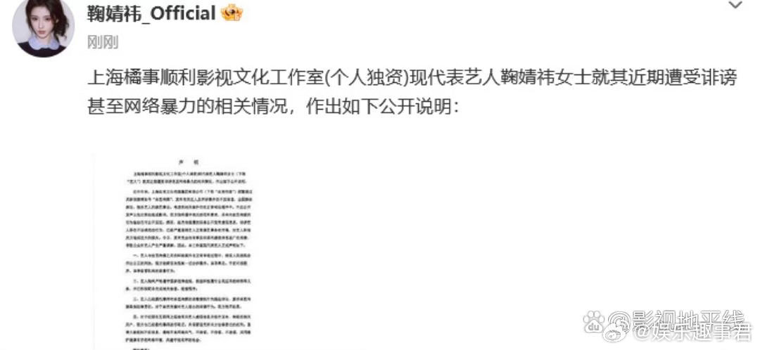 鞠婧祎工作室声明鞠婧祎工作室回应称,艺人始终严格遵守国家法律法规,依法积极履行公民应尽的纳税等义务,并已积极配合完成相关抽查、检查程序。艺人已委托律师对丝芭传媒的恶意侵权行为提起诉讼,要求丝芭传媒承担法律责任。