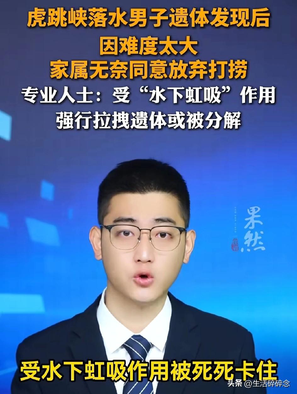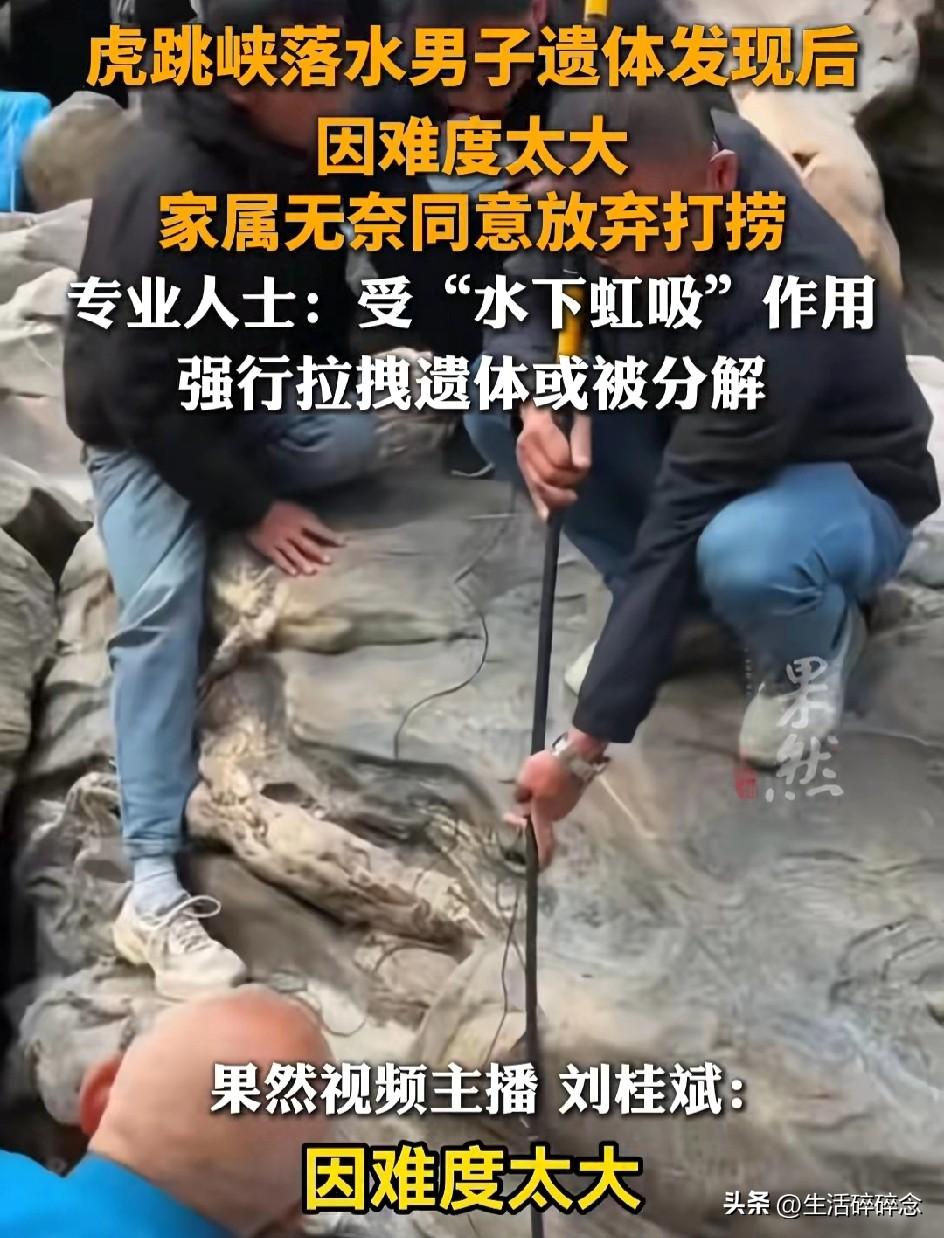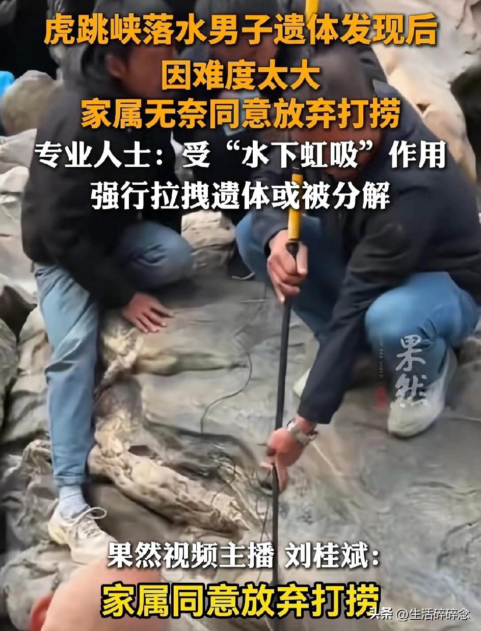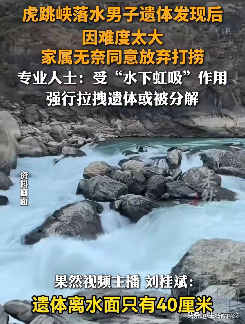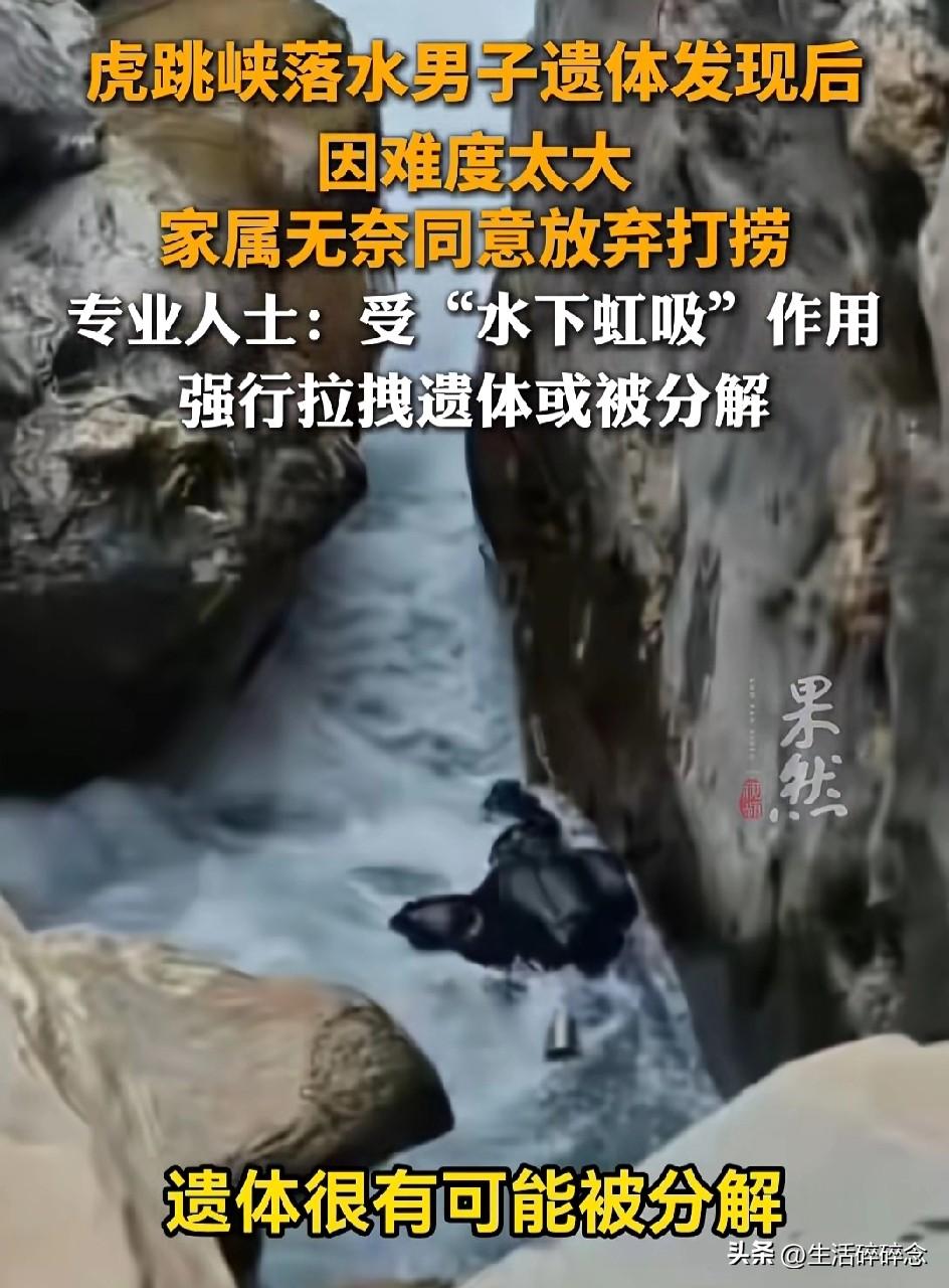 虎跳峡男子遗体找到却无法打捞,距水面仅40厘米,家属含泪放弃:怕用力就碎了 近日,虎跳峡“发疯石”落水事件传来最终消息:失联十余天的男子遗体终于被找到,但因为水下吸力太大,多次打捞均失败,家属最终无奈选择放弃,让他永远留在了这片冰冷的江水中。 2月25日下午,一名山东籍年轻男子和女友前往中虎跳峡网红打卡点“发疯石”游玩。当时排队拍照的人很多,男子在石头边洗茶杯时,脚下一滑,瞬间被湍急的金沙江卷走。 女友吓得崩溃大哭,赶紧用登山杖去拉,结果登山杖当场被激流冲断。同行向导见状立刻跳水救人,也差点被江水卷走,幸好被岸边游客拉回。 事发后,当地消防、救援队立刻展开搜救,可虎跳峡水流太急、礁石密布,连续搜寻多日都没有男子的踪迹。直到3月上旬,救援人员用水下探头才在落水点附近的石缝里,找到了男子的遗体。 遗体离水面只有40厘米,看着近在咫尺,却怎么也捞不上来。 救援人员透露,遗体被死死卡在水下石缝中,江水形成的强力虹吸像巨大的吸盘,把人牢牢吸住。专业潜水员多次下水,把绳子系在遗体上用力拖拽,可遗体纹丝不动,连水下探头放进去都差点被吸走 。 更让人揪心的是,遗体已经在冰冷江水中浸泡十几天,组织变得脆弱。如果强行拖拽,很可能直接被扯碎、分解,对家属造成二次伤害。 据悉,男子是家中独生子,母亲年迈,原本和女友旅行结束后就要结婚。家属赶到现场后,最大的心愿就是带他回家,哪怕只带回一部分也好。 但在救援人员反复劝说下,看着近在眼前却无法触碰的亲人,家属最终含泪同意放弃打捞。 随着春夏雨季到来,金沙江水位上涨、水流更急,以后再也没有打捞的可能 。 有人说,虎跳峡的风景有多美,危险就有多近。网红打卡点看着壮观,脚下却是深不见底的激流和暗藏的漩涡。 一场意外,一个家庭破碎,一段即将开始的幸福戛然而止。 愿逝者安息,也提醒所有人:出门游玩,安全永远比拍照更重要。