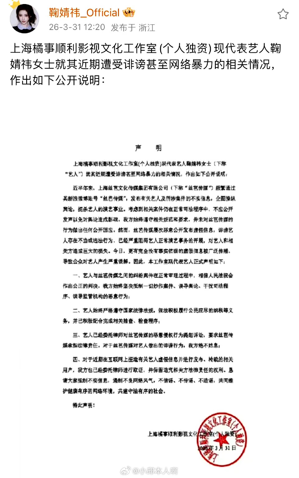 鞠婧祎工作室出来回应了!说丝芭告她偷税漏税全是瞎编,就是想带节奏搞她。工作室强调,鞠婧祎一直老实交税,该配合的检查都配合完了。现在双方各执一词,咱们吃瓜群众还是理性点,别被带偏了,等官方调查结果再说。鞠婧祎已配合完成税务抽查程序