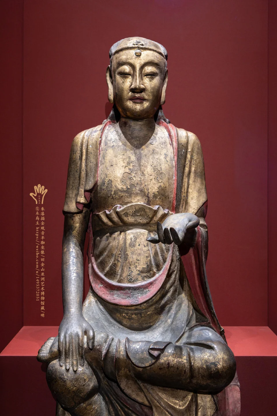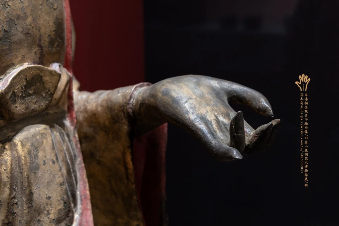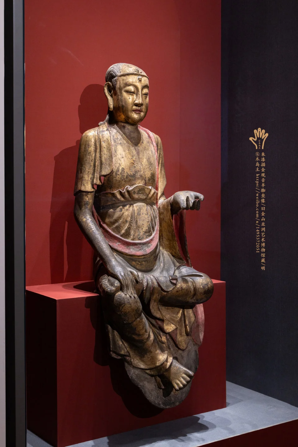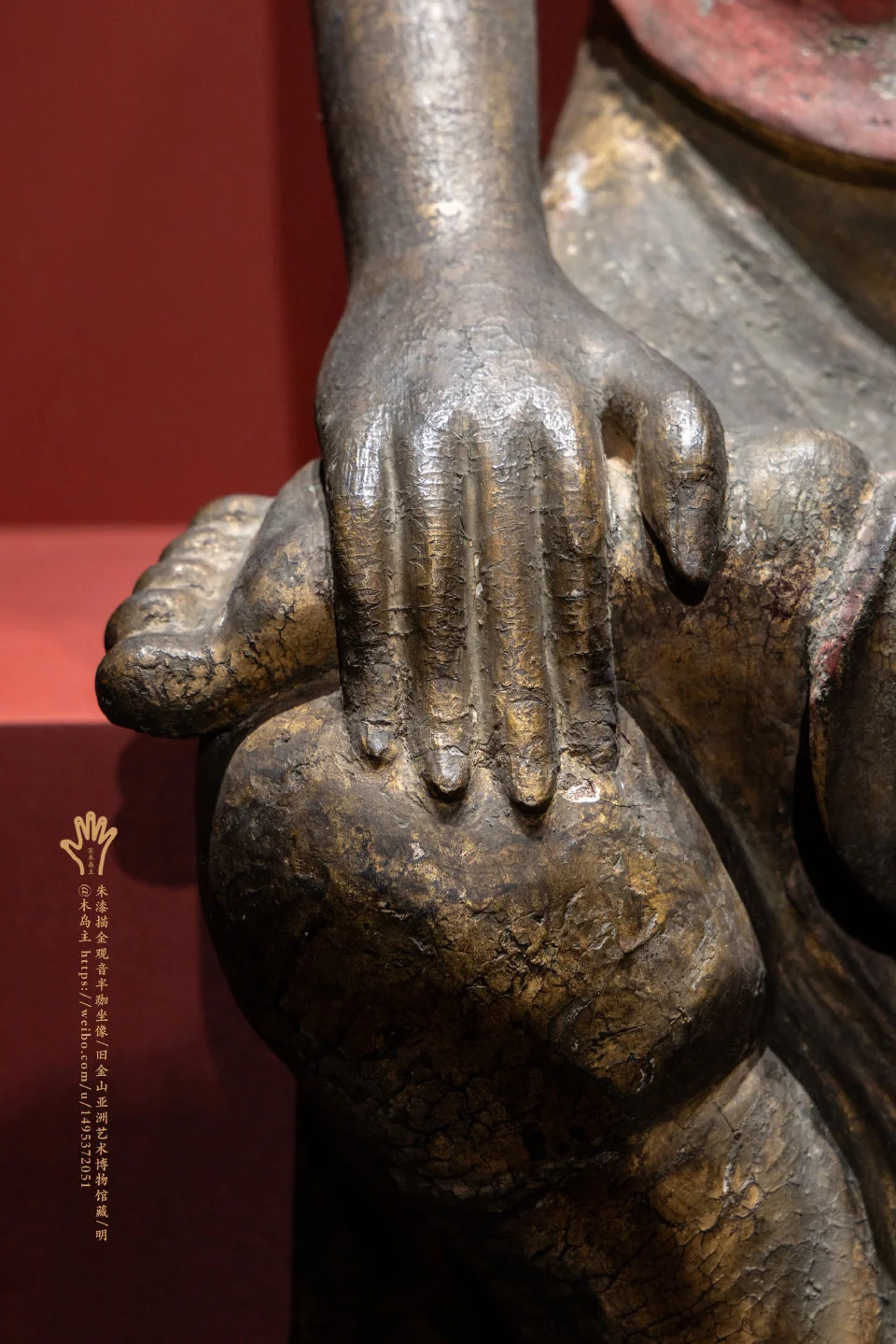 朱漆描金观音半跏坐像,明代。 苏州博物馆正在展出的大漆三章——宋元明清髹饰艺术展,汇集了这一时期最具代表性的漆器精品,而这尊观音像是其中的耀眼之作。 半跏坐(倚坐)是佛教造像中常见的坐姿,单膝支起,另一腿横置,姿态闲适优雅。 观音通体朱漆,描金装饰,色彩浓烈而不失温润,展现出明代宫廷漆器工艺的精湛水准。 大漆之美,美在岁月——千年不腐,越磨越亮。