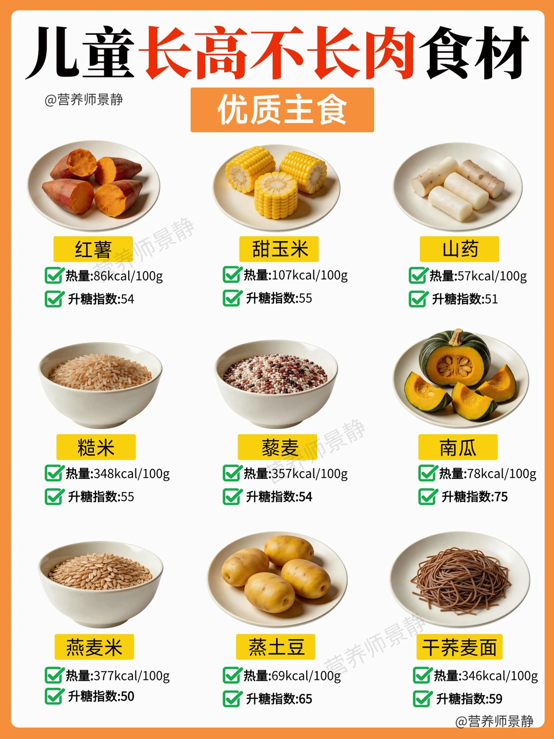 很多孩子减脂时主食吃太少,反而影响长高。关键是把精细主食换成更稳血糖、更有饱腹感的优质主食,比如:玉米、红薯、燕麦、糙米、藜麦、荞麦面等。
