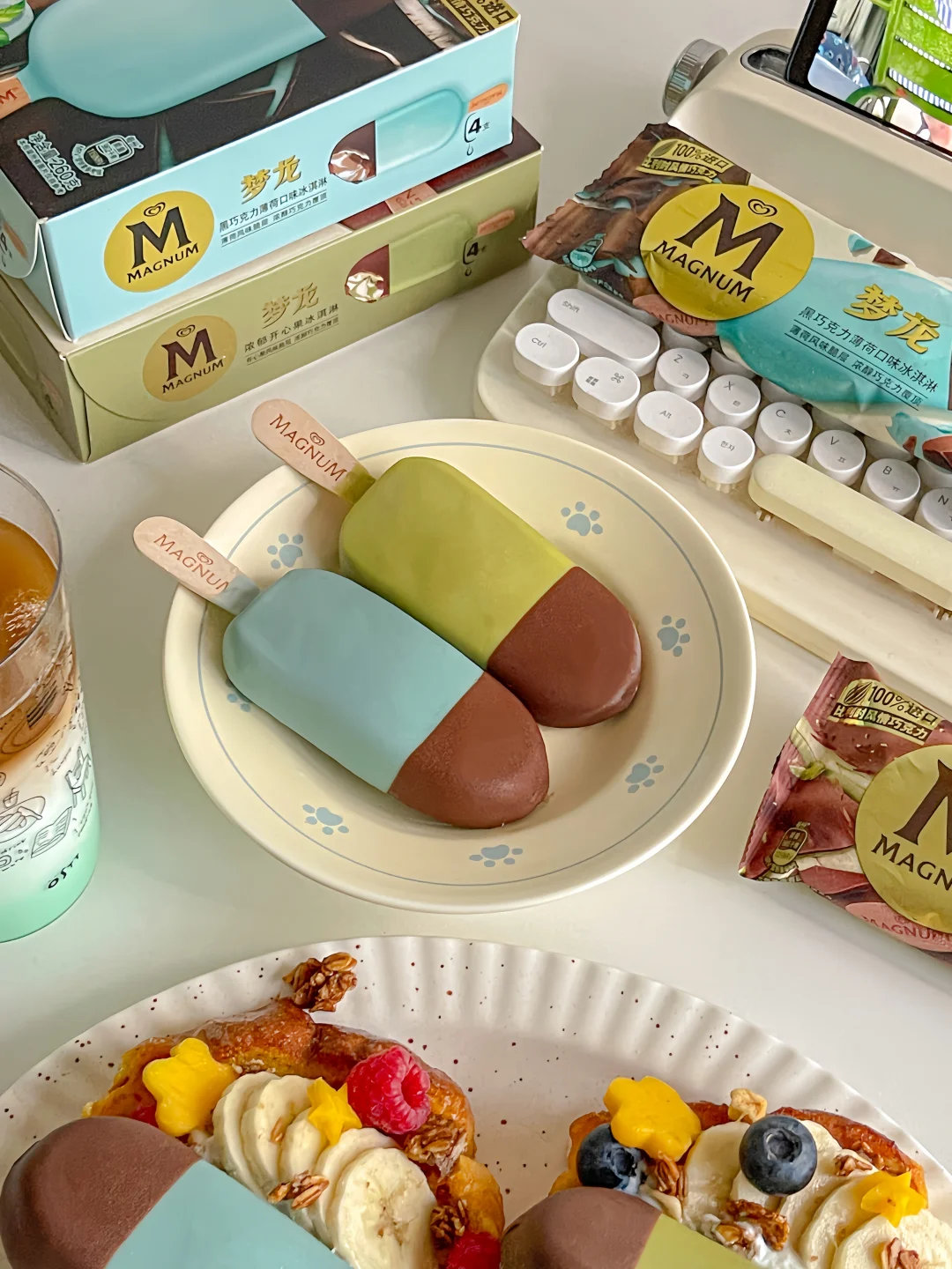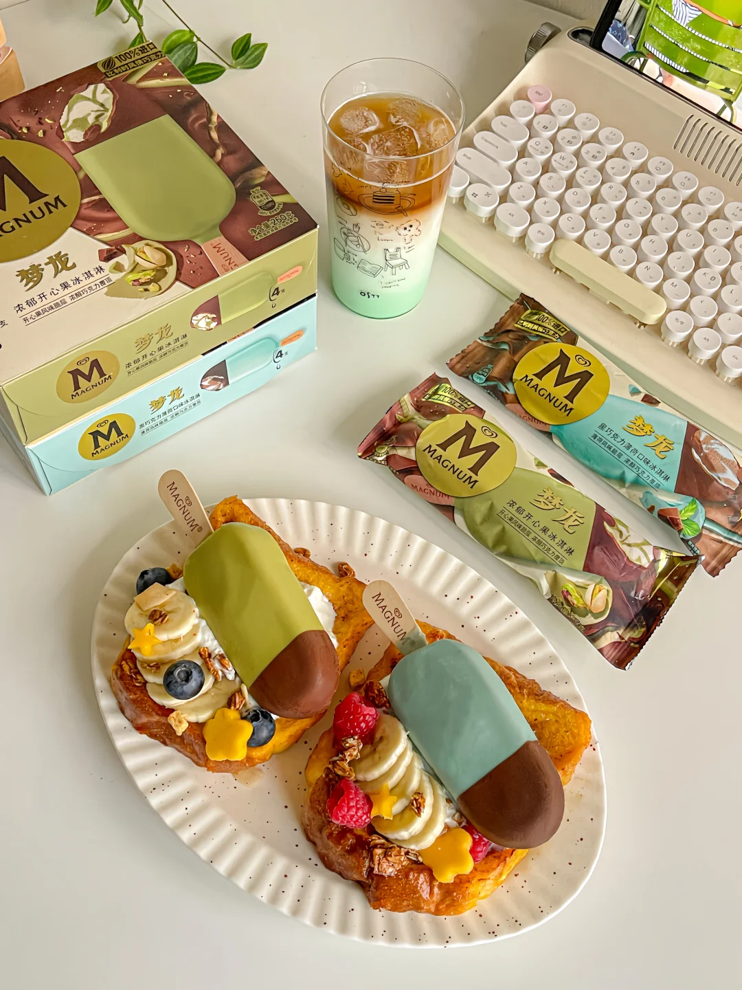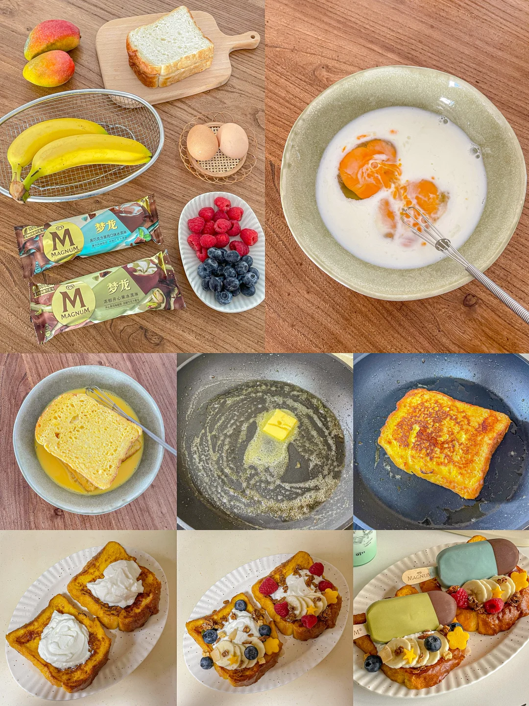 梦龙巧克力冰淇淋➕吐司➕鸡蛋➕蓝莓➕树莓➕香蕉➕希腊酸奶➕烘焙麦片➕芒果➕黄油