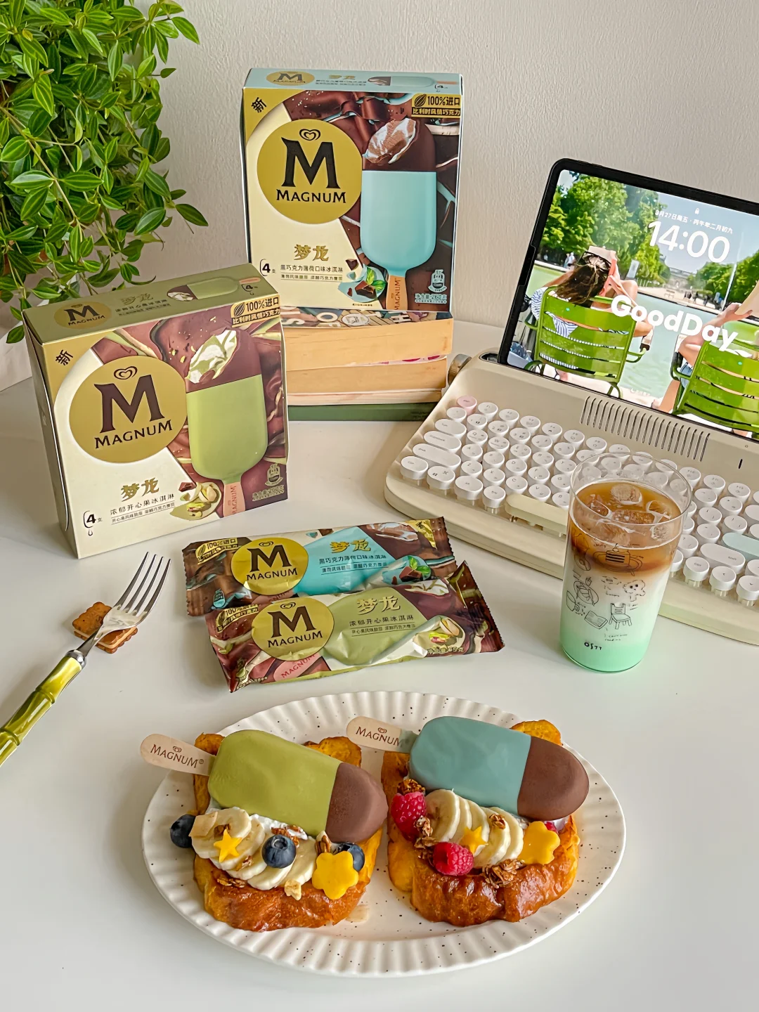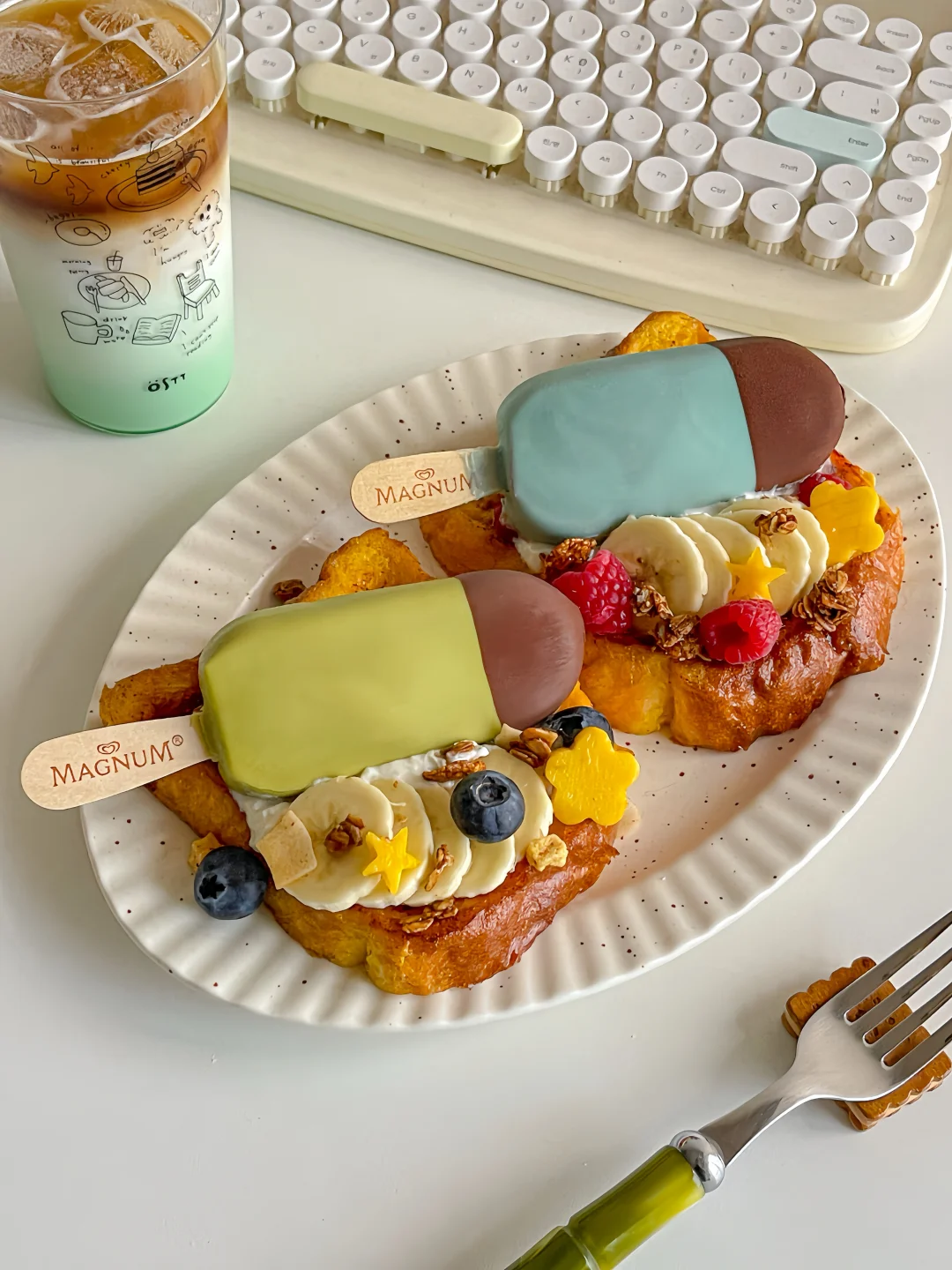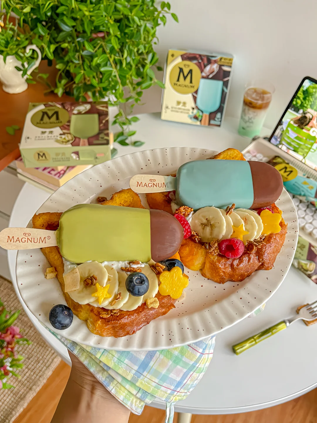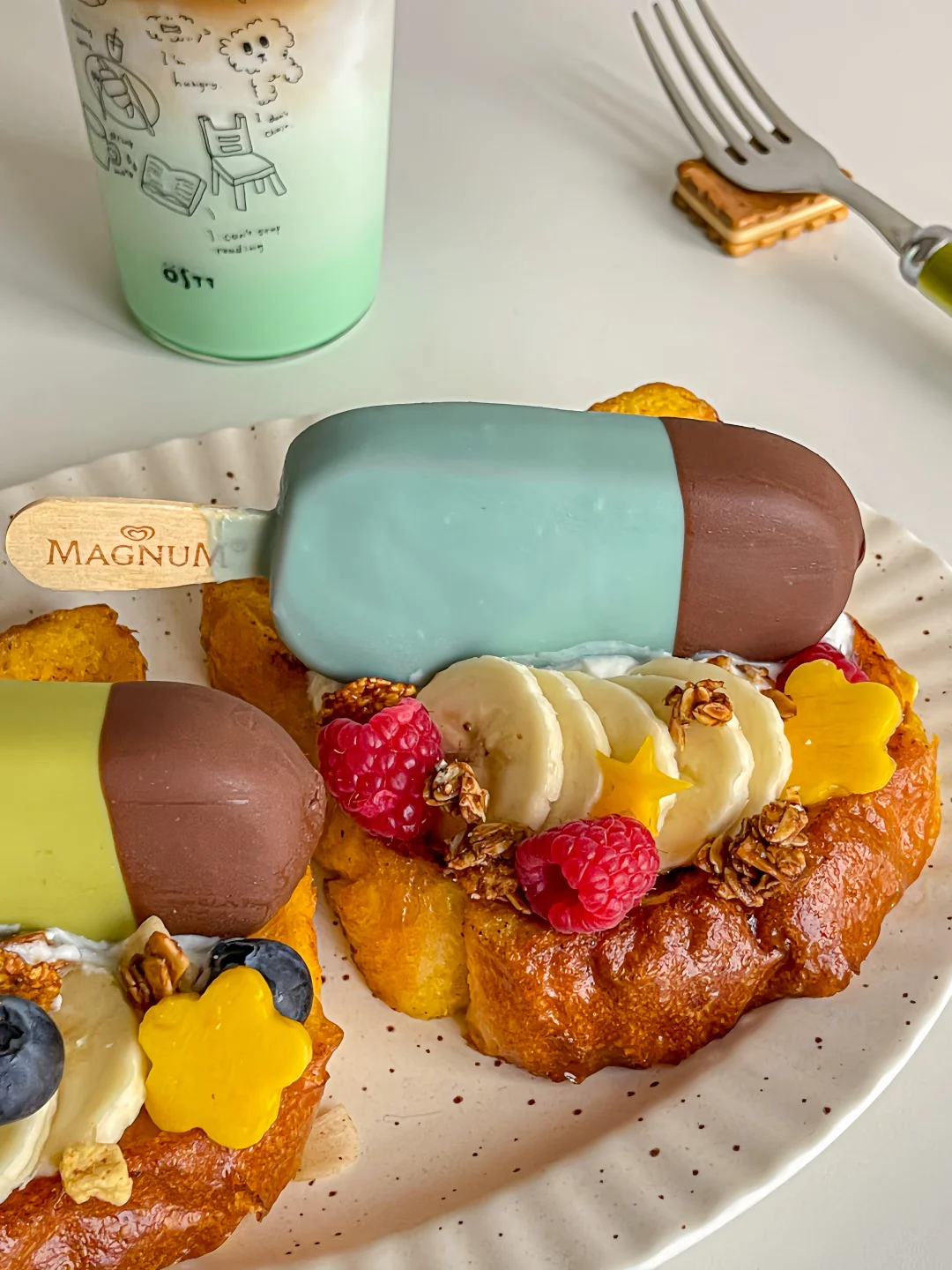 梦龙巧克力冰淇淋➕吐司➕鸡蛋➕蓝莓➕树莓➕香蕉➕希腊酸奶➕烘焙麦片➕芒果➕黄油