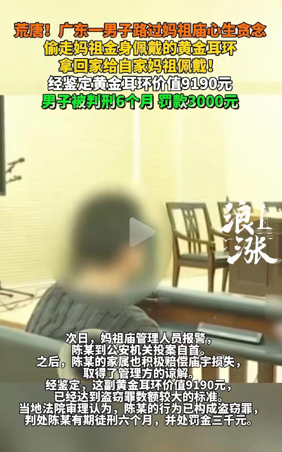 广东汕头,男子路过妈祖庙,看到金身上的黄金耳环不错,于是偷偷摘回家,给自己家里供