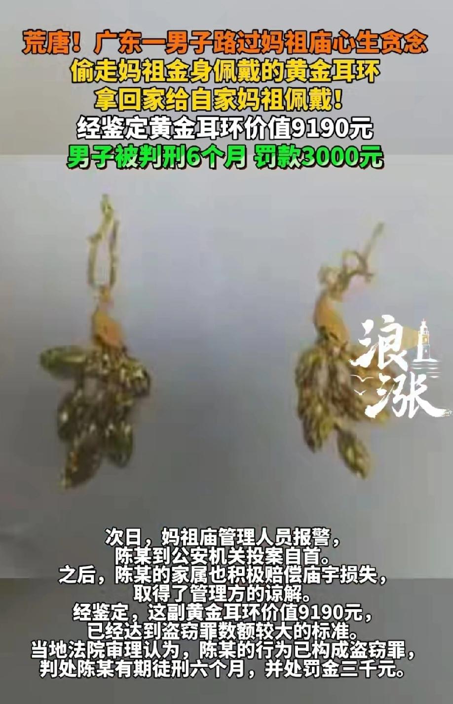 广东汕头,男子路过妈祖庙,看到金身上的黄金耳环不错,于是偷偷摘回家,给自己家里供奉的妈祖戴上。第二天,妈祖庙工作人员就报警求助,男子不仅退赔了价值9190元的金耳环,还被法院判处有期徒刑半年,罚金3000元。 男子陈某一时糊涂,想给自家供奉的妈祖神像“添点光彩”,结果不仅没成,反而把自己送进了班房。 那天下午,陈某像往常一样出门闲逛,走着走着路过当地一处妈祖庙。 平日里他就信奉妈祖,没事总爱来庙里转转,烧柱香。 可这天,他的目光刚落在妈祖金身身上,很快就被那对金灿灿的耳环给勾住了。 看着妈祖金身上佩戴的黄金耳环,锃亮晃眼,陈某心里突然冒出个念头:我家里也供着妈祖呢,可我的神像光秃秃的,戴上这个耳环一定很体面。 这个念头一旦冒出来,就像野草一样疯长。 陈某越想越觉得“亏得慌”,甚至还冒出个荒唐的想法:不如把庙里这副耳环偷回去,给我家的妈祖戴上,也算给自家神像添妆了。 他心里其实也打鼓,知道偷东西不对,可看着那对耳环,又觉得都是给妈祖神像用,算不得的“偷”,顶多就是“借”来用用。 在这种自我安慰的心思作用下,陈某彻底放松了警惕。 四周看了看,没发现管理人员,陈某便蹑手蹑脚地走到神像前,伸手就去摘那对黄金耳环。 他动作很快,生怕被人撞见,三下五除二取下耳环,揣进兜里,转身就匆匆离开了妈祖庙。 回到家,陈某赶紧把耳环拿出来,小心翼翼地戴在了自家供奉的妈祖神像耳朵上。 看着神像终于有了“配饰”,他心里还美滋滋的,觉得自己办了件“贴心事”,完全没意识到已经触犯了法律。 纸终究包不住火。第二天一早,妈祖庙的管理人员例行查看时,一眼就发现妈祖金身的耳环不见了。 这可是庙里的重要供奉物品,管理人员立刻报了警。 警方接到报案后,迅速展开调查,通过调取周边监控、询问相关人员,很快就锁定了盗窃耳环的陈某。 面对民警,陈某知道躲不过去,只好老老实实承认了自己偷耳环的行为,随后主动到公安机关投案自首。 事后,陈某的家属也意识到了问题的严重性,积极联系妈祖庙管理方,赔偿了庙宇的全部损失,最终取得了管理方的谅解。 经鉴定,陈某偷走的这对黄金耳环价值9190元。 根据盗窃罪的司法解释规定,盗窃公私财物价值1000元至3000元以上就属于“数额较大”,这起案件的涉案金额已经远远超过了入罪标准。 法院认为,陈某以非法占有为目的,秘密窃取他人财物,数额较大,其行为已构成盗窃罪。 考虑到陈某有自首情节,归案后认罪态度良好,家属也积极退赔并获得了被害人谅解,法院依法对其从轻处罚。 依据《刑法》第264条规定:盗窃公私财物,数额较大的,或者多次盗窃、入户盗窃、携带凶器盗窃、扒窃的,处三年以下有期徒刑、拘役或者管制,并处或者单处罚金。 最终,法院依法判处陈某有期徒刑六个月,并处罚金三千元。 世上难买后悔药,陈某怎么也没想到,一时贪念换来的不是给神像“添妆”的满足,而是半年的牢狱之灾和三千元的罚金,简直得不偿失。 要知道,庙宇里的供奉物品并非无主之物,这同样受法律保护。 不管是出于什么目的,只要是非法占有他人财物,哪怕只是给神像戴个耳环,也终将难逃法律的制裁。