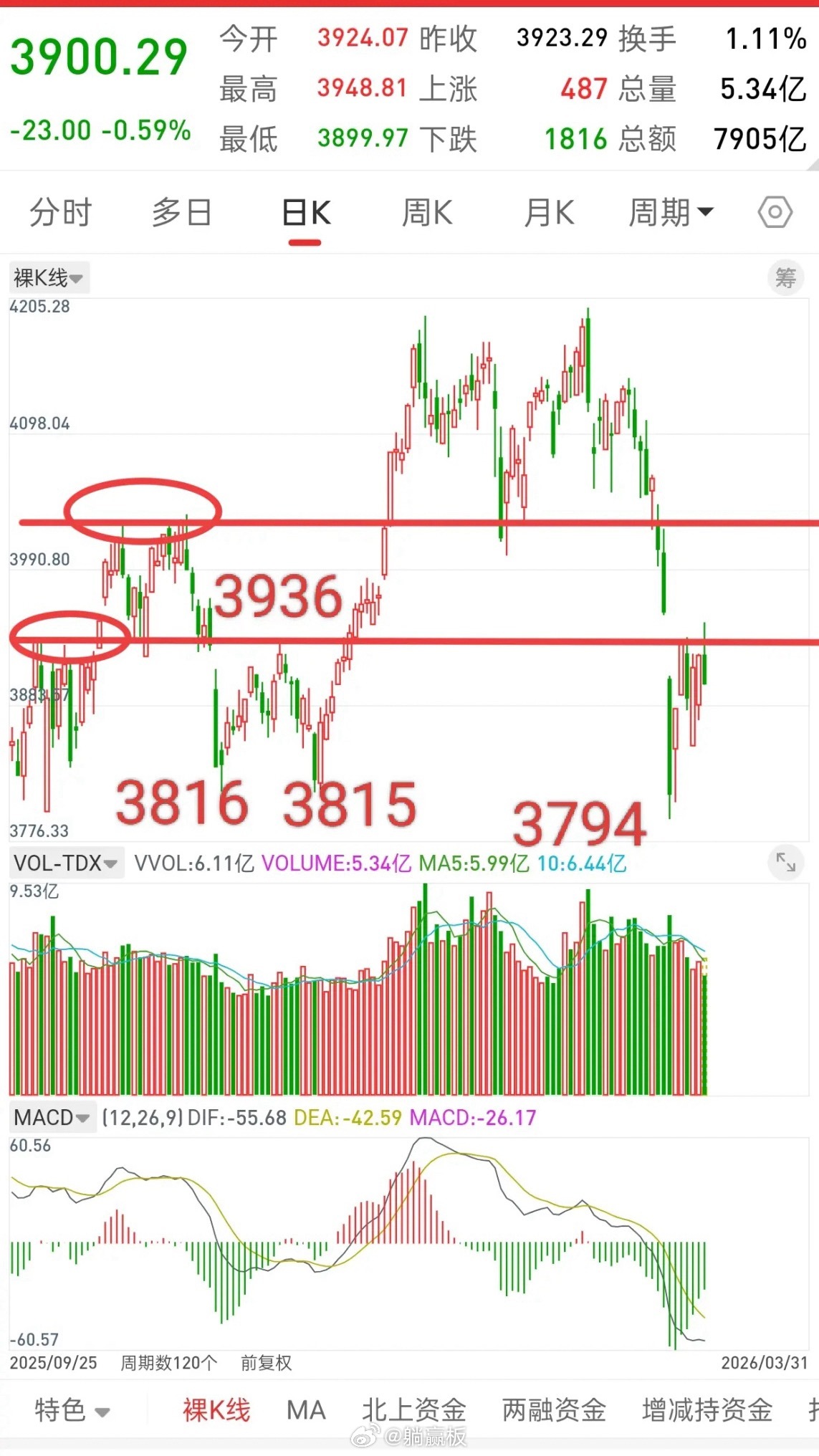 而这波从4797一路下跌至3794,跌幅403点,第一波反弹到今天为止3948,第一波反弹空间154点。