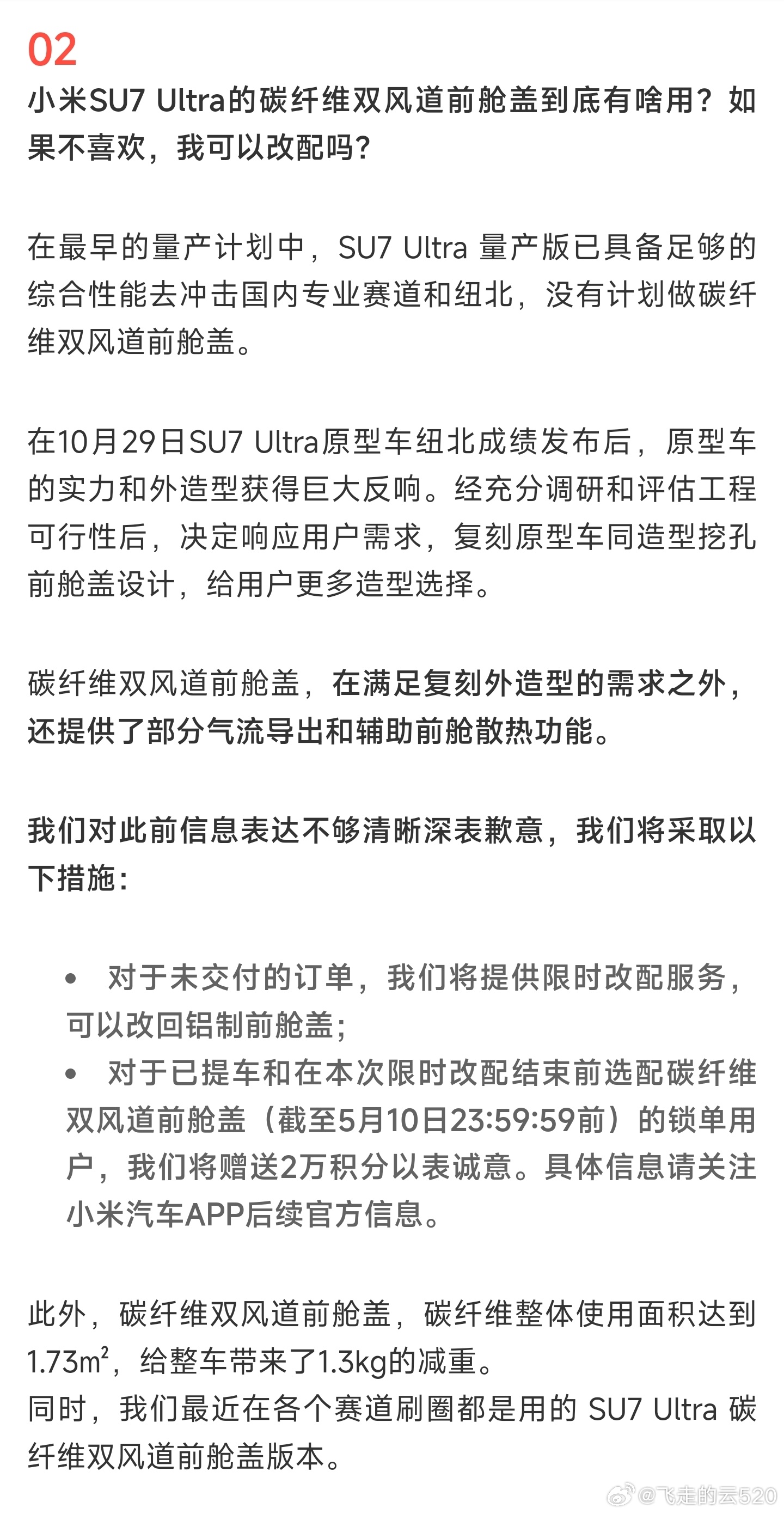 从小米SU7Ultra的时间线来看,小米最初并没有做碳纤维机盖。