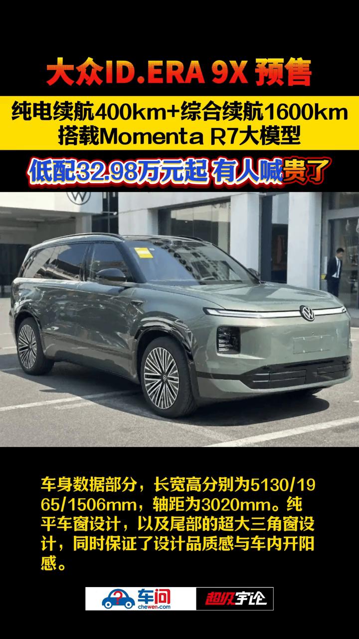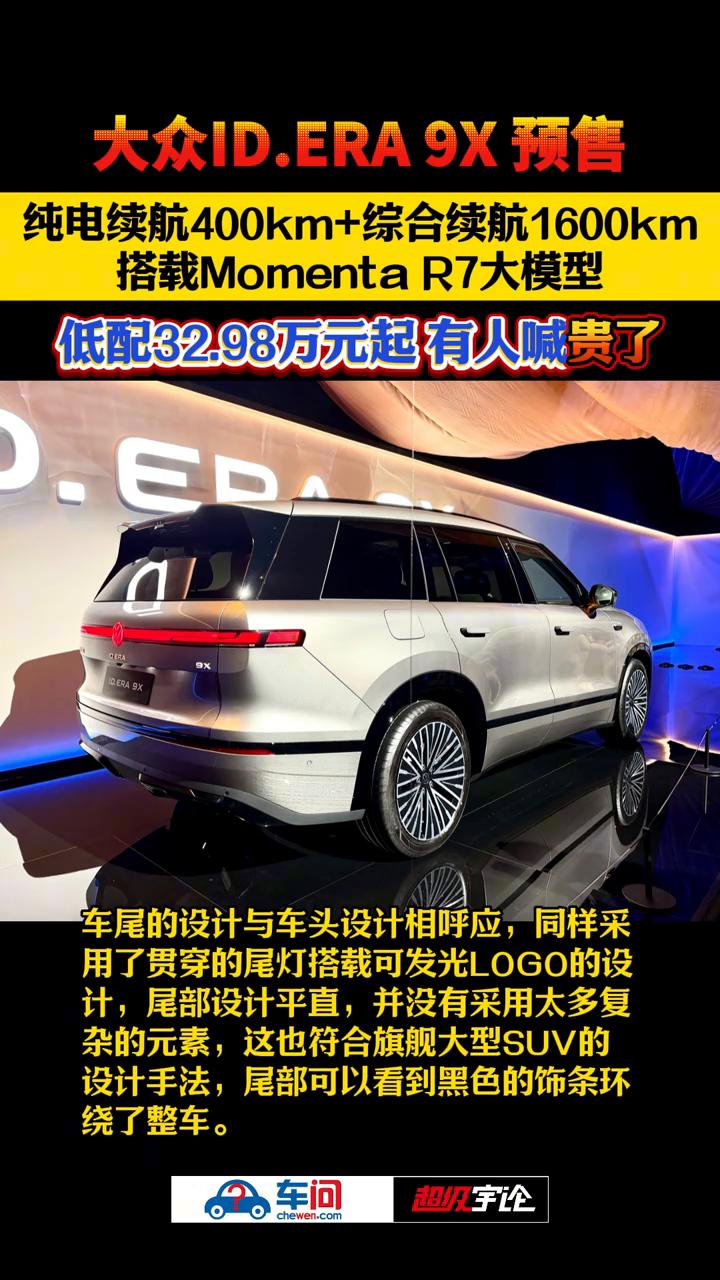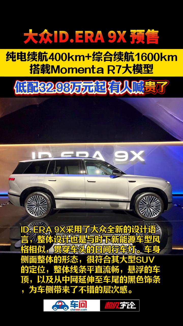 纯电续航400km+综合续航1600km,搭载Momenta R7大模型,低配32.98万元起有人喊贵了。 3月30日,上汽大众公布旗下"德系满级旗舰SUV"一ID.ERA9X的预售价格。本次共推出Pro、Max、Ultra三款四驱版车型,预售价分别为32.98万元。不过在新车型预售价格发布之后,有不少媒体和网友认为:比很多人此前预计的29.98万起贵了不少。 ID.ERA9X新车的长宽高分别为5207mm、1997mm、1810mm,轴距达307mm。定位为大型增程式SUV,搭载65.2kWh大容量电池,纯电续航突破400公里,同时还搭载Momenta R7大模型和九屏交互系统座舱。 ID.ERA9X采用了大众全新的设计语言,整体设计也是与时下新能源车型风格相似,贯穿车头的日间行车灯。车身侧面整体的形态很符合其大型SUV的定位,整体线条平直流畅,悬浮的车顶以及从中网延伸至车尾的黑色饰条,为车侧带来了不错的层次感。 车身数据部分,长宽高分别为5130/1965/1506mm,轴距为3020mm。纯平车窗设计以及尾部的超大三角窗设计,同时保证了设计品质感与车内开阳。车尾的设计与车头设计相呼应,同样采用了贯穿的尾灯搭载可发光LOGO的设计,尾部设计平直,并没有采用太多复杂的元素,这也符合旗舰大型SUV的设计手法,尾部可以看到黑色的饰条环绕。 内饰采用环抱座舱的设计理念,木纹样式的饰板从中控台延伸至两侧车门,15.6英寸的双联屏、8.88英寸的仪表屏以及抬头显示,集成了全车功能的操作与控制。 ID.ERA9X采用的是前双叉臂+后五连杆独立悬架,但只有高配车型搭载双腔空气弹簧+DCC自适应悬架。全系标配动态零重力座椅(主驾/副驾/二排右侧),支持16向电动调节、加热。 动力上,ID.ERA9X搭载的是1.5T增程器+前后双电机的动力结构,全系采用800V高压平台,增程器使用的则是大家熟知的EA211,系统综合最大功率503/517kW,综合扭矩660N·m。