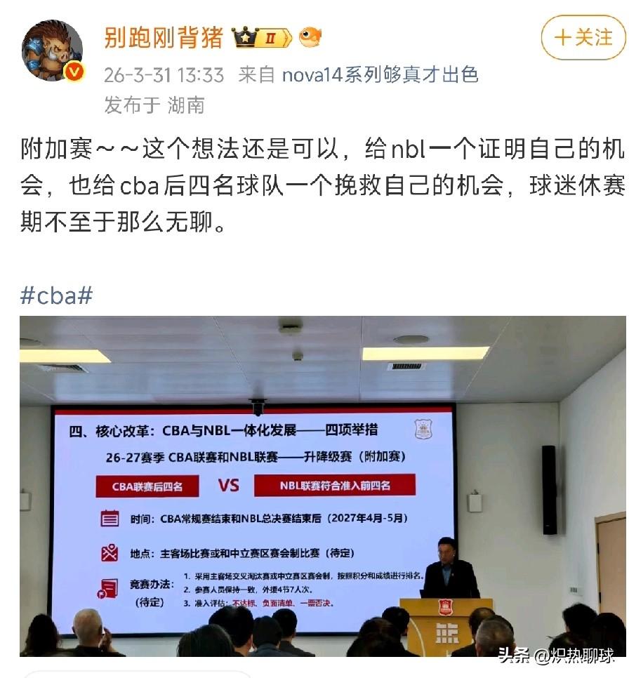 根据著名媒体人:“别被刚背猪”发布的消息,之前说的CBA升级制有了具体的行动方案和时间了,将会在下赛季2027年4月到5月举行CBA升降级赛(附加赛),参加球队是CBA后四名和NBL前四名球队。目前CBA后四名球队分别是:南京同曦,江苏肯帝亚,天津先行者,四川丰谷酒业。NBL前四名是:香港金牛,合肥狂风,上海玄鸟,江西鲸裕