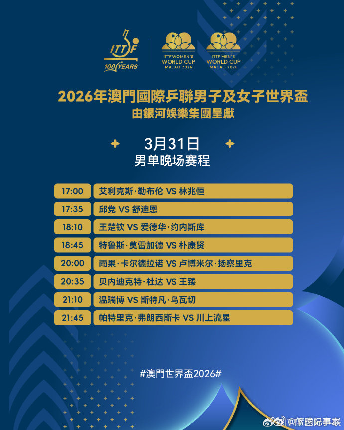 2026澳门乒乓球单打世界杯3月31日晚间赛程,国乒王楚钦、温瑞博登场,锁定T1主赛场。