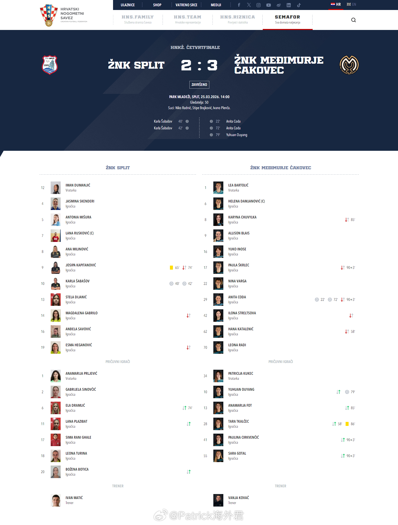 欧阳玉环 克罗地亚首球。2026年3月25日,克罗地亚女子足协杯1/4决赛,梅吉穆列查科韦茨在客场3比2力克斯普利特,20岁中国球员欧阳玉环(2006)在下半场开场替补登场,第79分钟打进制胜进球,帮助球队晋级四强。另外三支晋级球队分别是哈伊杜克斯普利特、萨格勒布迪纳摩和阿格拉姆。