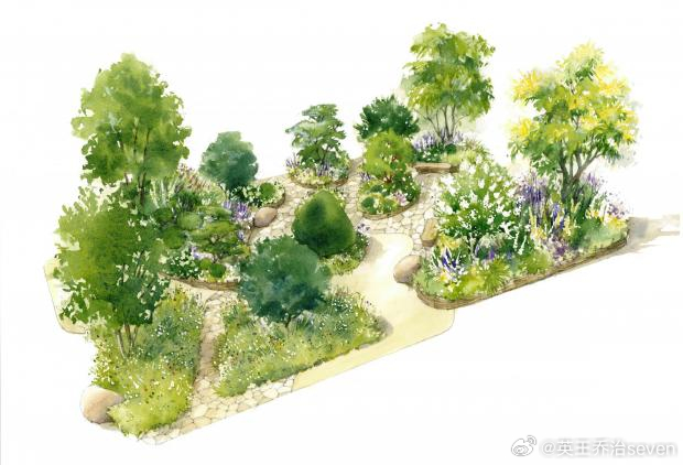 一幅受自然图案启发的插图展示了花园蜿蜒的小径、生物多样性的植栽和反映自然中反复出现的图案的铺装。