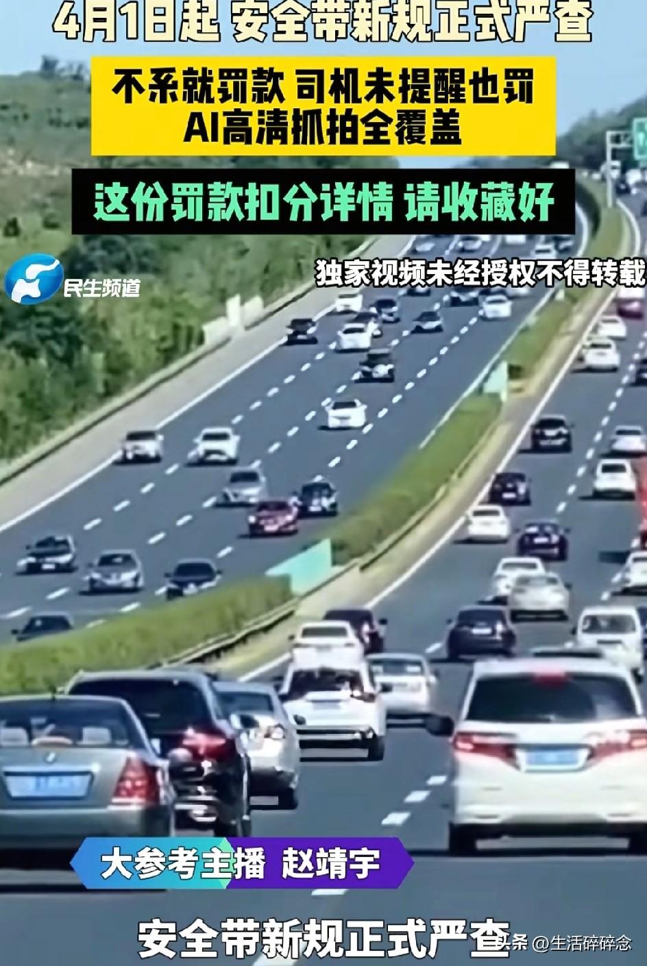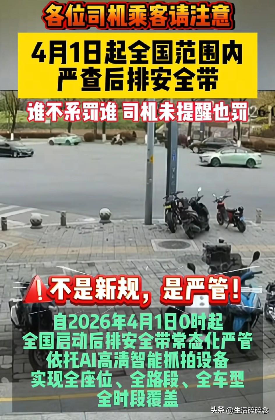 从4月1日开始,全国将迎来最严安全带新规,不管你是坐前排还是后排,只要不系安全带,就要面临罚款,再也没有“后排豁免权”这一说了。 很多人一直有个误区,觉得后排空间大、安全,车速慢、路程短,系不系无所谓。甚至坐朋友车、网约车,后排乘客习惯性不系,司机也不好意思多说。 但这次新规落地,就是要彻底改掉这个坏习惯。而且最关键的一点是:谁不系罚谁,不搞连坐,司机不再替乘客背锅。 新规执行后,责任划分非常清晰: 后排乘客自己不系,罚款自己交,和司机、其他乘客无关; 司机没尽到提醒义务,单独罚司机,记1分+罚款50元; 多人不系,按人数分别处罚,不合并、不减免。 高速、城市快速路是严查重点,查到直接罚50元/人,没有首次警告,没有缓冲期 。普通道路首次违规一般先警告,再犯就罚款20-50元。 不管是私家车、网约车、出租车,还是7座车、商务车,只要车上有安全带,就必须系好。14岁以上人群没有豁免,老人、孕妇都要系;4岁以下小孩必须用儿童安全座椅,不能用大人抱着代替。 之所以这次动真格,是因为太多血的教训。 高速上车辆失控,后排没系安全带的人直接被甩出车外;市区急刹车,乘客一头撞在前排座椅上导致骨折、截瘫;甚至低速追尾,都能造成致命伤害 。 数据显示,后排不系安全带,事故死亡率是系安全带的3.5倍。很多时候,意外就在一瞬间,安全带就是最后一道保命防线。 4月1日起,高清AI探头全覆盖,穿透车窗贴膜,识别率超98%,不系、斜挎、从腋下穿、用卡扣规避,都能被拍得一清二楚。 别再心存侥幸,也别嫌麻烦。一根安全带,系的是安全,保的是性命。 上车就系安全带,前排后排都一样,既是对自己负责,也是对家人负责。