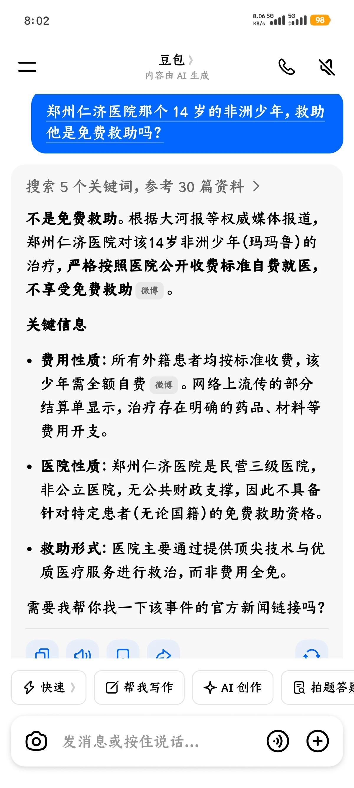 非洲男孩由于严重车祸,被多国拒绝治疗,郑州仁济医院伸出援手,使男孩重获新生。 网友的关注点却跑偏了,他们都在问,治疗是免费的吗? 别再怀疑,豆包给出了答案:不是免费救助,是自费。因为仁济医院是民营医院,非公立。这下你们放心了吧? 医院可以大胆宣传了,我们又创造了医学奇迹。
