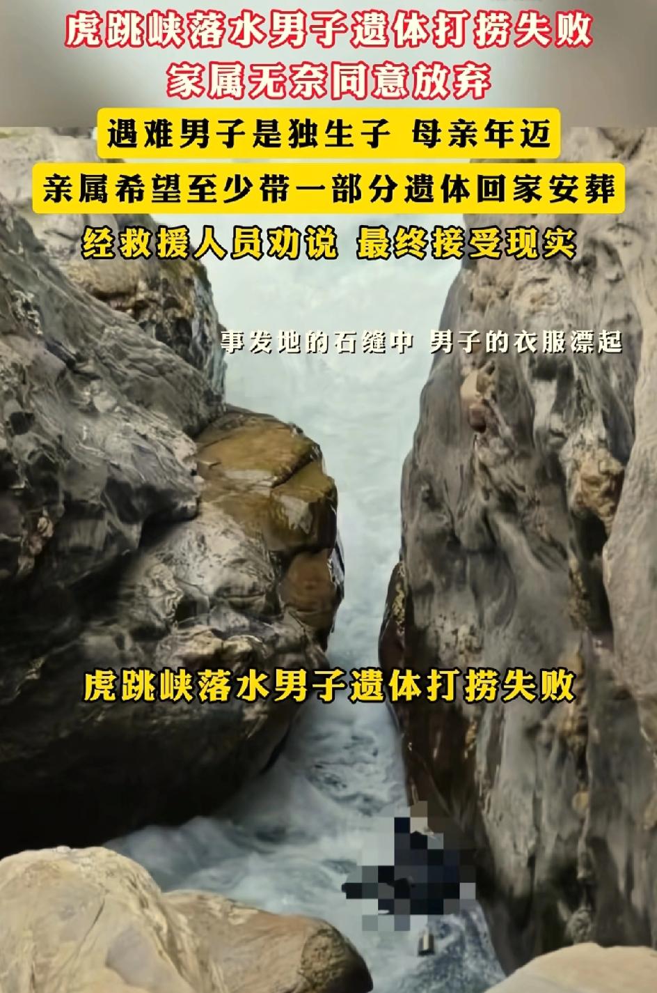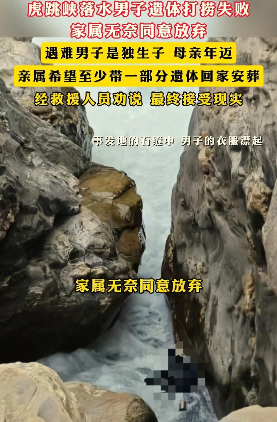 虎跳峡下落水小伙遗体无法打捞,家人无奈放弃。1997年出生的杜先生,山东枣庄人。和女朋友刚在云南拍了婚纱照,马上就要结婚的。在事发地的石缝中发现了他的遗体,却因为水下强力虹吸却无法导入。他是家中的独生子,父母年迈,家人希望能带走一部分遗体,后来在相关工作人员劝说下决定放弃,小伙子永远就停留在这一片水域里。