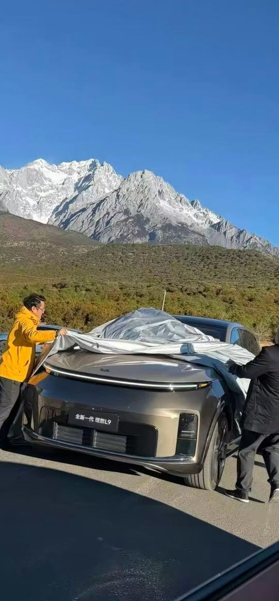 全新理想L9实车,路边拍宣传片被拍了。雪山底下揭车衣,疑似广告片拍摄现场。车都拍