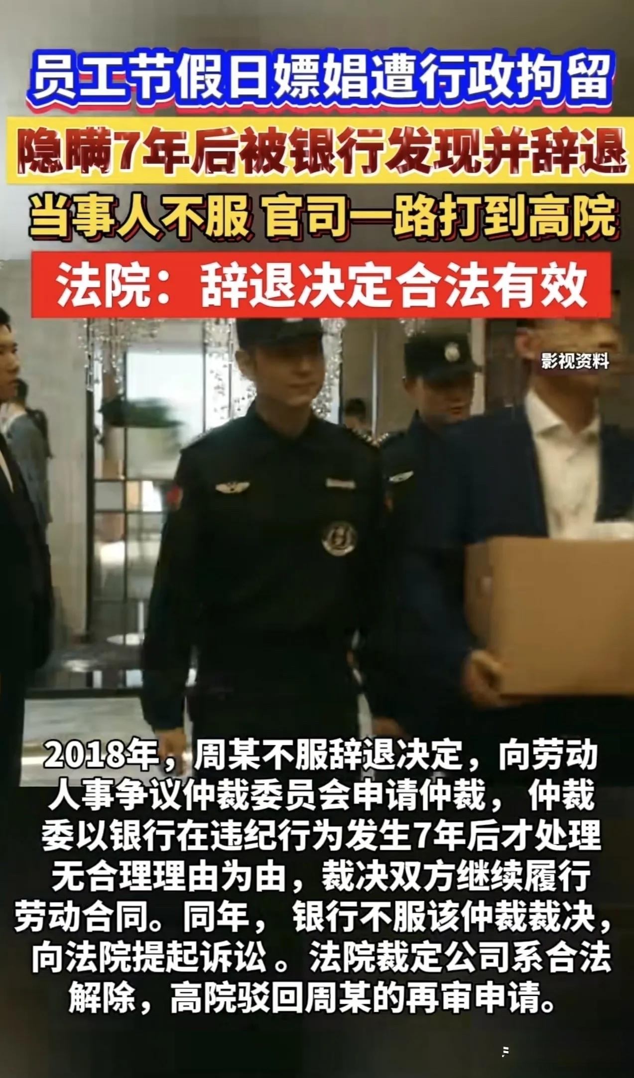 “7年前的事,凭啥现在开除我?”山东一银行员工假期嫖娼被拘10天,隐瞒不报7年后被银行发现,当即开除!男子不服:追溯期都过了!连续3次状告银行,官司打到高院,法院这样判! 7年前嫖娼被拘,隐瞒7年后被银行发现开除,男子怒告:凭什么? 一、一次“放松”,埋下7年的雷 周军是山东某银行的资深员工,2005年就入了职,在岗位上勤勤恳恳干了多年,算是银行里的老人了。 2011年9月底,银行放了个长假,周军独自出门游玩。途中进了一家按摩店,在服务人员推荐下,一时糊涂接受了违法特殊服务。结果赶上民警查房,当场被抓。 公安机关依法对他处以行政拘留10日、罚款5000元。 周军心里清楚,这事要是让单位知道,自己多年的工作肯定保不住。于是他向银行谎称“个人原因”请了几天假,硬是把这事瞒了下来。从拘留所出来后,他照常上班,以为这件事就此翻篇了。 二、7年后东窗事发,银行:开除! 周军本以为这事已经尘封,没想到2017年5月,银行开展员工赌博行为专项排查时,意外查到了他2011年的嫖娼违法记录。 银行核查后认为:第一,嫖娼属于严重违法行为,违反了银行内部管理规定;第二,周军被处罚后刻意隐瞒,7年未上报,性质恶劣。于是当即作出解雇决定。 周军不服:违法行为都过去7年了,追溯期早过了,银行凭啥开除我?他先申请劳动仲裁,仲裁委支持了他的主张,要求银行撤回解雇处理。 银行不认可,双方闹上法庭,官司一路打到了省高院。 三、法院判决:开除合法,员工败诉 银行认为: 银行2010年就通过了《员工违规处理办法》,明确规定了此类行为符合解雇条件。周军不仅违法,还刻意隐瞒7年,违背了诚实信用原则。根据《劳动合同法》第三十九条,严重违反规章制度的,用人单位可以解除劳动合同。 周军认为: 根据《行政处罚法》第三十六条,违法行为两年内未被发现,不再给予行政处罚。他的事都过去7年了,早过了追溯期,而且情节轻微,银行依据内部规定辞退他,属于程序错误、违法解除。 法院审理后认为: 周军的违法行为事实清楚,公安机关处罚合法适当,同时也严重违反了银行的规章制度。 至于周军说的“追溯期已过”,法院指出:银行时隔7年才处理,不是银行的过错,而是周军刻意隐瞒造成的。用人单位对员工在职期间违法违纪行为的处理权,不受行政处罚时效的约束,尤其是在员工故意隐瞒的情况下。 最终,一审、二审、高院再审均认定:银行解除劳动合同合法,驳回周军的诉讼请求。 写在最后:隐瞒不是“翻篇”,有些账迟早要算 周军的案子,说白了就是一句话:当初埋的雷,迟早会炸。 很多人觉得,行政处罚的追溯期只有两年,过了就“安全”了。但法院判得很清楚——用人单位的内部处理,不适用行政处罚的时效规定。你瞒得住一时,瞒不住一世,单位什么时候发现,什么时候就有权处理。 更关键的是,周军不仅在2011年犯了错,还在之后7年里选择了“隐瞒”。这个“隐瞒”本身,就是第二次踩红线。银行开除他,不是翻7年前的旧账,而是处理“在职员工隐瞒违法事实”这个新问题。 有人替周军喊冤,说7年前的事不该影响现在;也有人觉得银行做得对,员工违法还撒谎,不开除开谁? 你怎么看?如果你是这家银行的管理者,发现员工7年前的违法记录,你会怎么处理? 来源: 山东省高级人民法院裁判文书