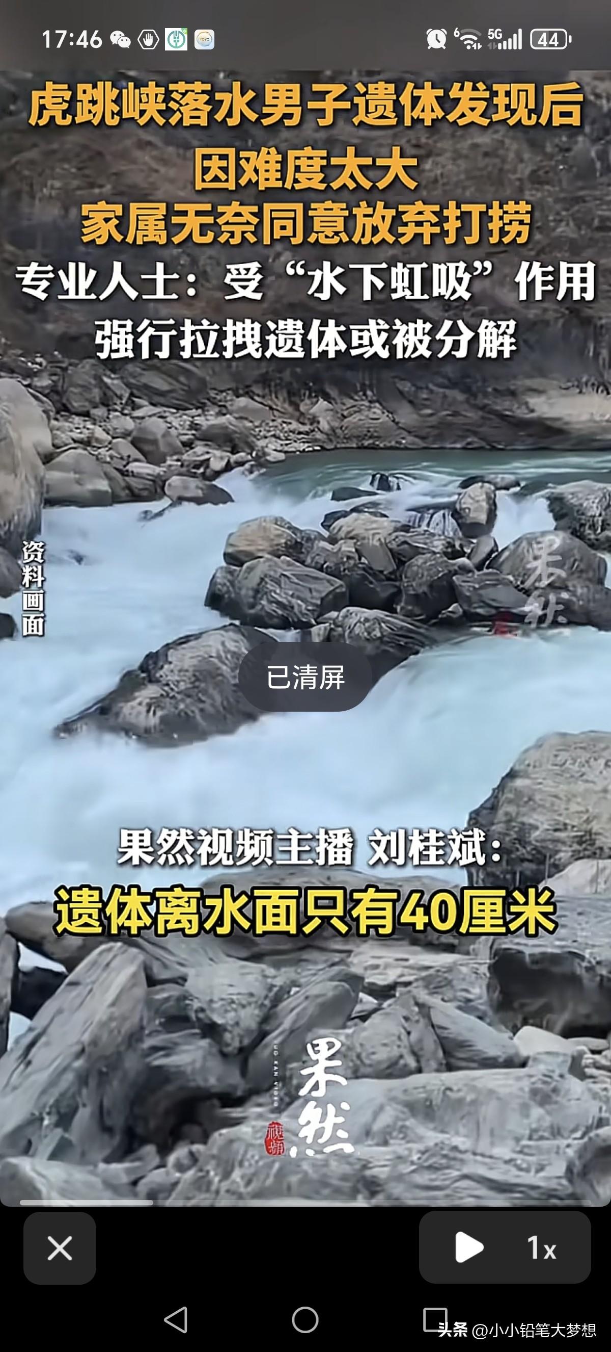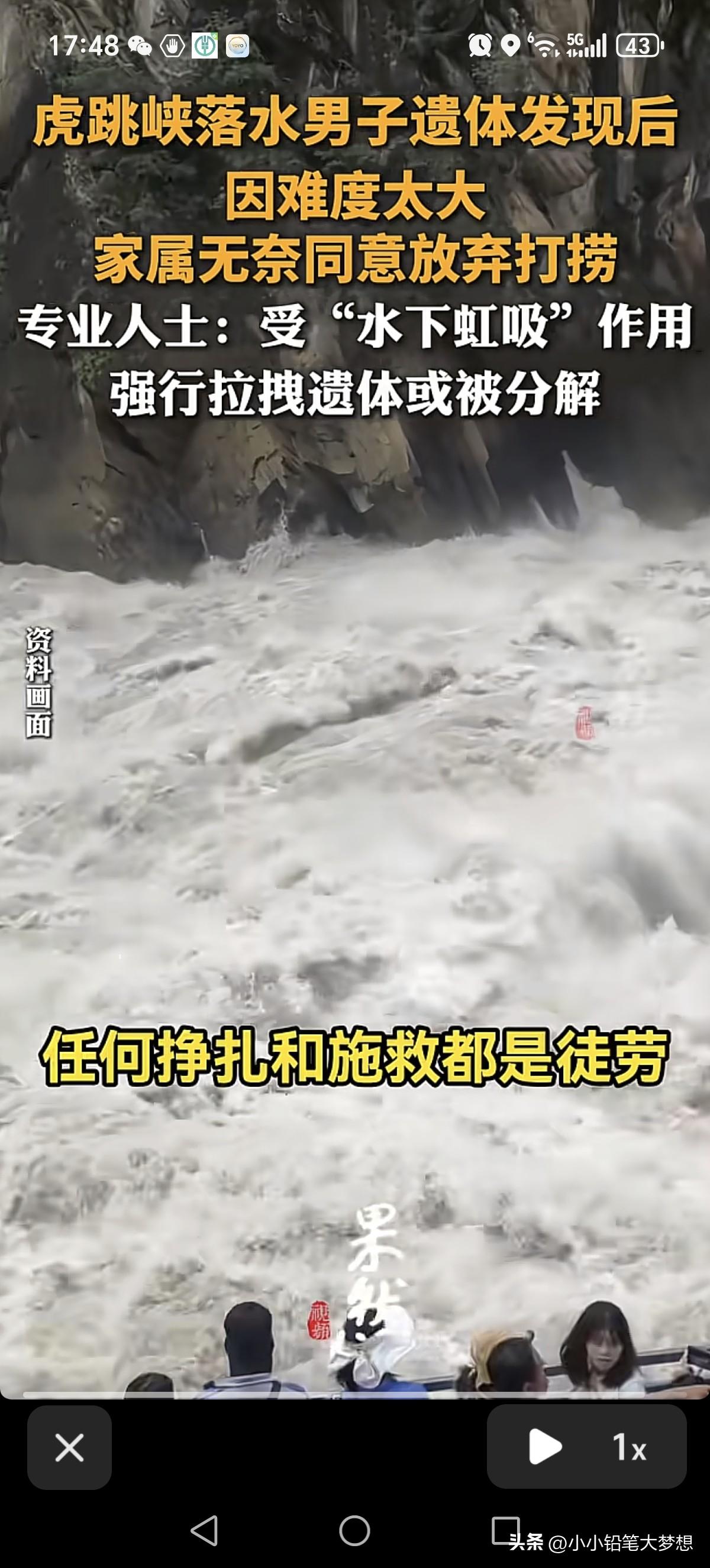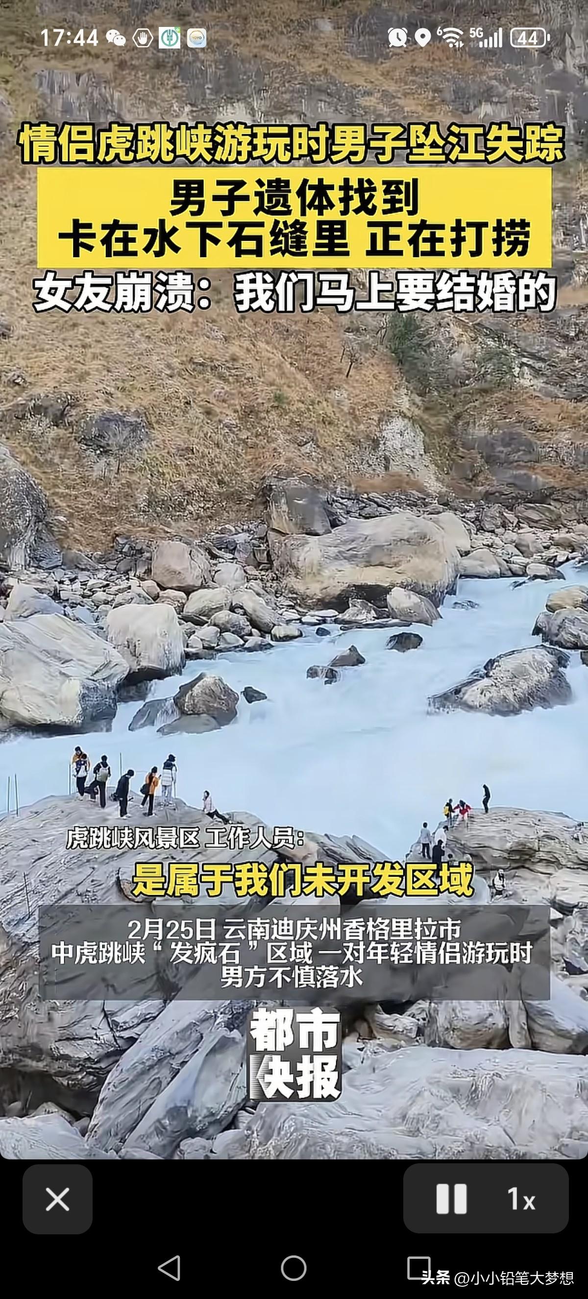 那位虎跳峡洗杯子落水29岁的美术老师的尸体再也捞不回来了,明明尸体被发现且距离水面仅仅40厘米,也不得不放弃打捞了! 2026年的2月25日下午只跟自己的未婚妻来到在虎跳峡游玩,两人当时还请了一位向导,他们本来想在“发疯石”这个地方拍一些照片回去,但在游玩的过程中他的不锈钢保温杯掉地上沾了泥巴,他立马想要把这个不锈钢的保温杯上的泥土洗干净,当时旁边站着他的未婚妻,未婚妻劝他用纸巾擦掉回去再洗吧,而向导也劝他不要在这个地方洗,向导说完这句话就暂时离开了, 但他根本没有听进去,还是冒险去洗这个杯子,可一个急浪准备打过去,他下意识躲了一下,脚下一滑,就掉到了水里了,他未婚妻第一时间也伸出了自己的登山杖,想要去救他,但是这里是每秒6到8米的急流,咋救啊?登山杖被激流打折了,未婚妻是眼睁睁的看着他掉了下去,失而不得救啊!而向导回来之后发现了他掉水里,也第一时间跳下去救人了,但水流太急了,还险遭不测。 这个“发疯石”这个名字一听就不得了,很多网红,户外博主都冒着险去这里拍片,因为地方拍出来照片很出片,很多人都在网上晒出了图片和视频,就越吸引更多的人来这里打卡,这个地方虽然不是开发的景区,但警示牌是立着,护栏安着,但他们翻越护栏,不顾生死非要拿到这个地方打卡。 而这名男子的行为更吓人,居然还下去洗杯子呢,人总是高估了自己,低估了自然! 失踪10天后,遗体在3月6号被发现,明明看见了遗体,而且离水面也不远,但是就是打捞不上来,因为这个地方的水域条件非常复杂,遗体又刚好卡在了虹吸的位置,被吸的死死的,根本就拉不上来! 潜水员也试过了各种努力,穿着3点式安全带下水把绳子穿在手上,却怎么拉也拉不动!试过放入水下探头,但是探头也差点被吸住。 如果强行拉上来的话,尸体会4分五裂,家属目前已经同意放弃打捞了,而最可悲的是,他还是家里的独生子啊,父母已经年迈了,好不容易把培养成人,准备要结婚却出了这等意外,白发人还要送黑发人! 这个地方河水湍急,吼声如雷,确实壮观,但也危险呐,所以啊,还是要敬畏大自然,不要随便去冒险! 家属也节哀吧,虽然拉不上来,但是这也没法子了,换一种想法,可能是他想留在他喜欢的地方吧。