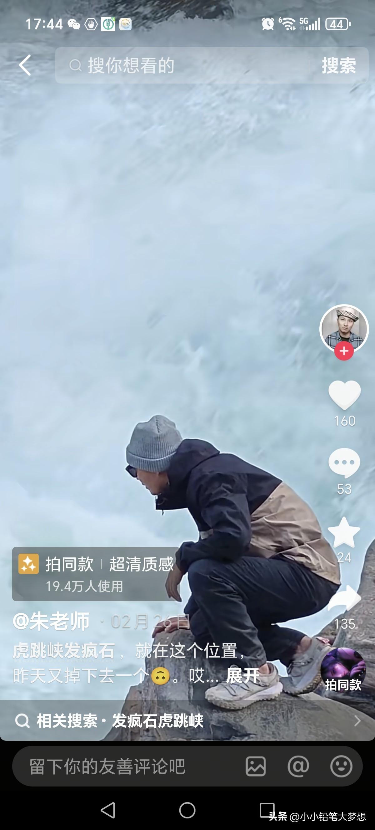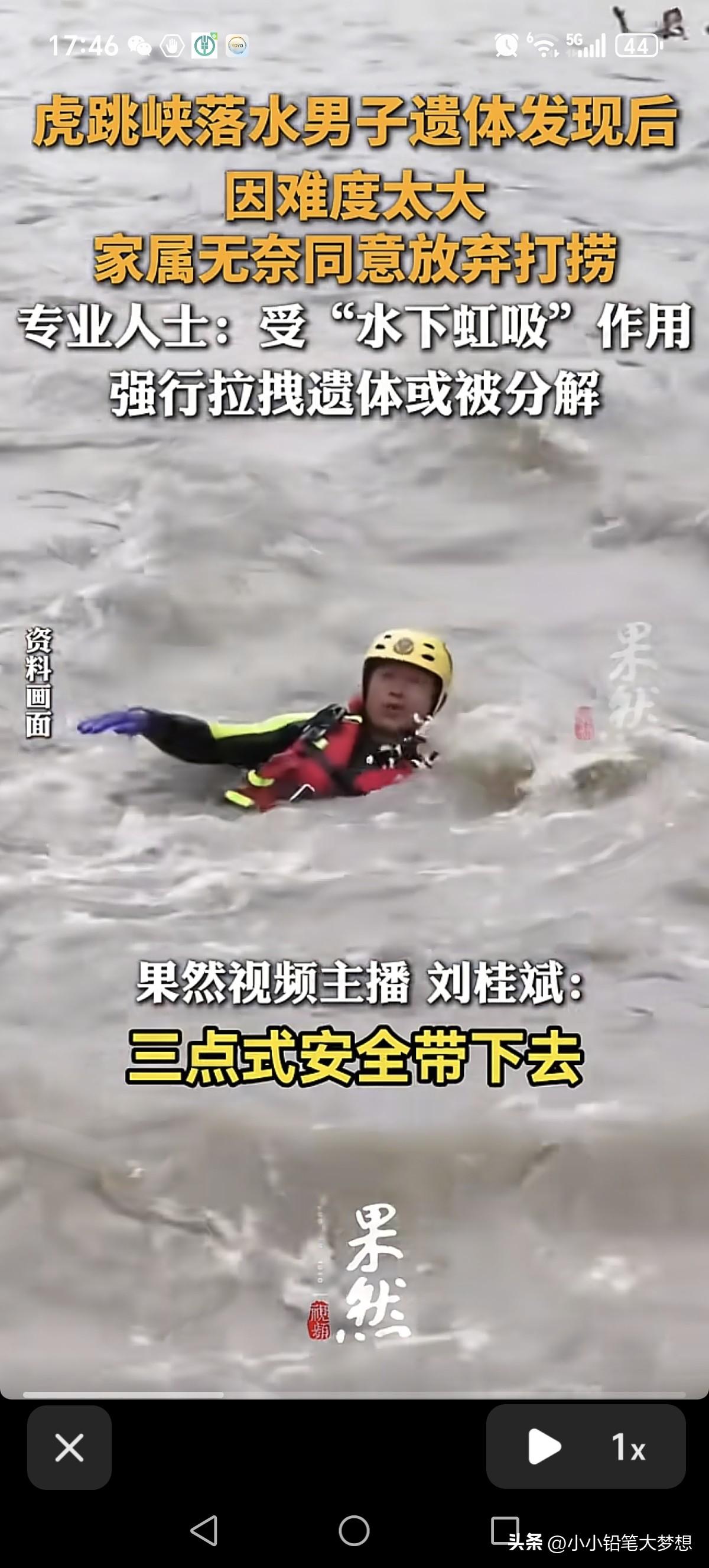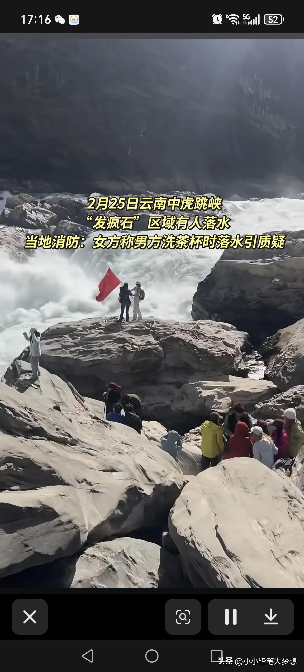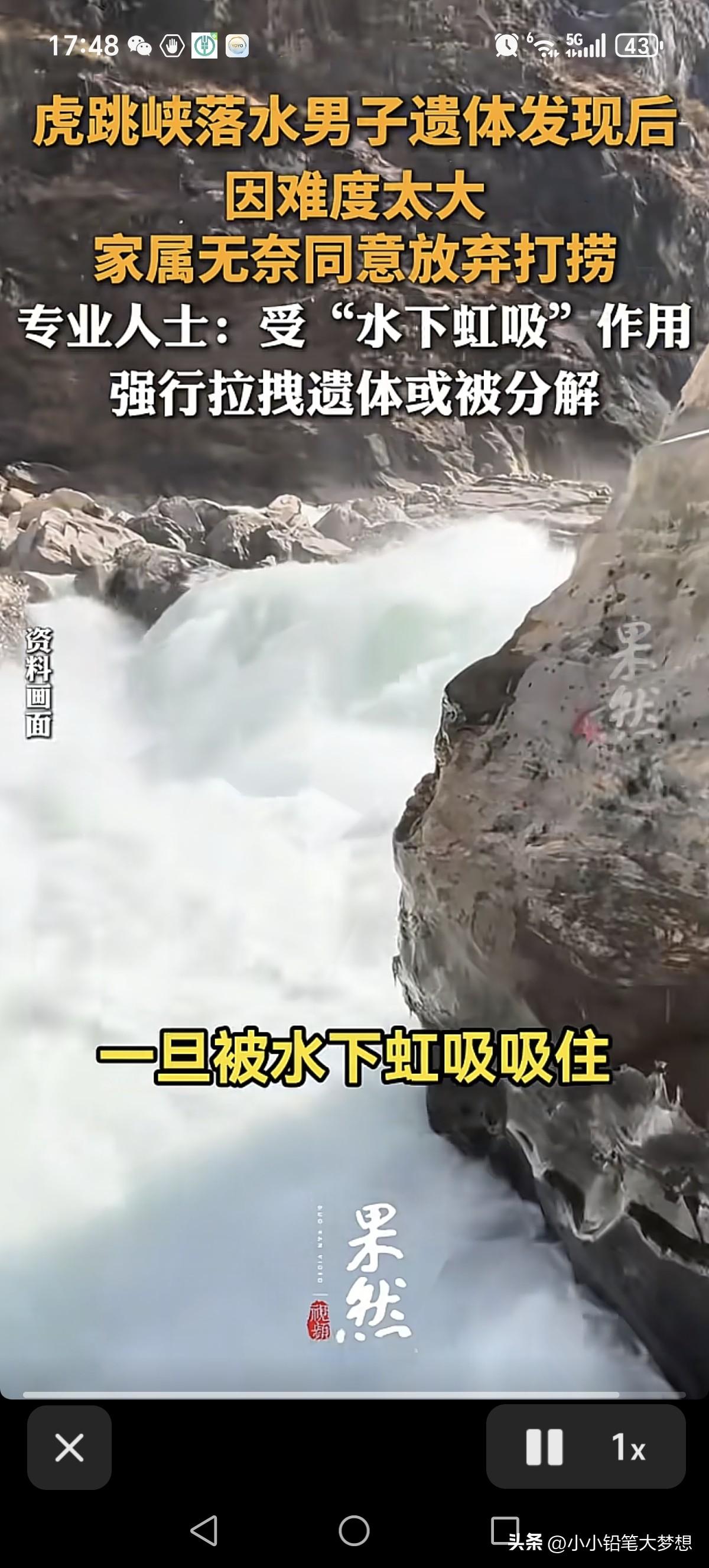 那位虎跳峡洗杯子落水29岁的美术老师的尸体再也捞不回来了,明明尸体被发现且距离水面仅仅40厘米,也不得不放弃打捞了! 2026年的2月25日下午只跟自己的未婚妻来到在虎跳峡游玩,两人当时还请了一位向导,他们本来想在“发疯石”这个地方拍一些照片回去,但在游玩的过程中他的不锈钢保温杯掉地上沾了泥巴,他立马想要把这个不锈钢的保温杯上的泥土洗干净,当时旁边站着他的未婚妻,未婚妻劝他用纸巾擦掉回去再洗吧,而向导也劝他不要在这个地方洗,向导说完这句话就暂时离开了, 但他根本没有听进去,还是冒险去洗这个杯子,可一个急浪准备打过去,他下意识躲了一下,脚下一滑,就掉到了水里了,他未婚妻第一时间也伸出了自己的登山杖,想要去救他,但是这里是每秒6到8米的急流,咋救啊?登山杖被激流打折了,未婚妻是眼睁睁的看着他掉了下去,失而不得救啊!而向导回来之后发现了他掉水里,也第一时间跳下去救人了,但水流太急了,还险遭不测。 这个“发疯石”这个名字一听就不得了,很多网红,户外博主都冒着险去这里拍片,因为地方拍出来照片很出片,很多人都在网上晒出了图片和视频,就越吸引更多的人来这里打卡,这个地方虽然不是开发的景区,但警示牌是立着,护栏安着,但他们翻越护栏,不顾生死非要拿到这个地方打卡。 而这名男子的行为更吓人,居然还下去洗杯子呢,人总是高估了自己,低估了自然! 失踪10天后,遗体在3月6号被发现,明明看见了遗体,而且离水面也不远,但是就是打捞不上来,因为这个地方的水域条件非常复杂,遗体又刚好卡在了虹吸的位置,被吸的死死的,根本就拉不上来! 潜水员也试过了各种努力,穿着3点式安全带下水把绳子穿在手上,却怎么拉也拉不动!试过放入水下探头,但是探头也差点被吸住。 如果强行拉上来的话,尸体会4分五裂,家属目前已经同意放弃打捞了,而最可悲的是,他还是家里的独生子啊,父母已经年迈了,好不容易把培养成人,准备要结婚却出了这等意外,白发人还要送黑发人! 这个地方河水湍急,吼声如雷,确实壮观,但也危险呐,所以啊,还是要敬畏大自然,不要随便去冒险! 家属也节哀吧,虽然拉不上来,但是这也没法子了,换一种想法,可能是他想留在他喜欢的地方吧。