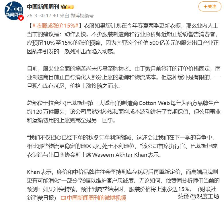 南亚冲突使买一件T恤要多花20块?大家买衣服的思路可以变一变了。 由于南亚地区冲突导致能源和物流成本飙升,服装制造业正面临不小的压力。有巴基斯坦的制造商透露,他们工厂的电费和运费都在涨,虽然之前签的订单价格还能扛一阵子,但等现有库存卖完,该涨的迟早会涨。行业里普遍预测,到今年夏天结束的时候,服装价格可能要涨10%到15%。 这个涨幅对于普通消费者来说,意味着一件原本200块的T恤,过几个月可能要花220多才能买到。尤其是那些走平价路线的品牌,成本压力传导得最快,吊牌价很可能会直接往上调,高端品牌或许还能自己消化一部分。但不管怎么说,商家也不可能一直赔本赚吆喝,最终买单的其实还是消费者。 这样一来,普通人的购物习惯可能就得跟着变一变了。正价渠道的价格一旦上去了,很多人自然会开始留意别的方式。 其实这几年已经有这个趋势了。以前大家买衣服,习惯盯着商场专柜或者品牌旗舰店,新品上市就冲。但现在越来越多人会先去奥莱、唯品会这种折扣渠道翻一翻,看看同样的牌子有没有打折。 就拿唯品会来说,一直是做的品牌特卖的生意,这两年铁粉也越来越多,就是因为大家发现——同样的衣服,换个渠道买,质量都一样,但价格可能只有正价的一半甚至更低。 说到底,衣服涨价这事不是消费者能控制的。但怎么买、在哪儿买,主动权还是在自己手里。与其被动接受涨价,不如主动换个思路,把预算花得更聪明一点。毕竟,穿得好看和花得值,这两件事本来就不冲突。