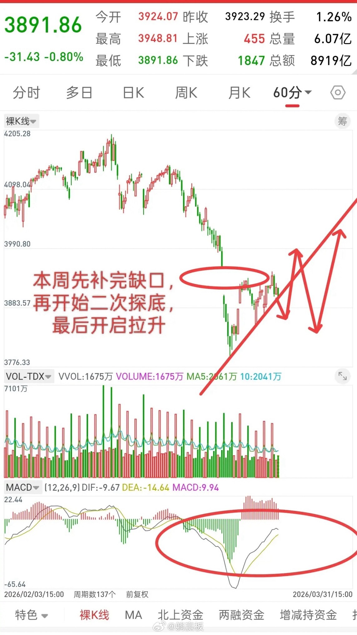 我认为明天行情会有一个低点3870附近,然后后面两天再开启反攻,往上直接补掉缺口3955,大概能到3960左右,一旦补了缺口,后面很可能就会来一波大级别二次探底,到时右底我预计3820左右。