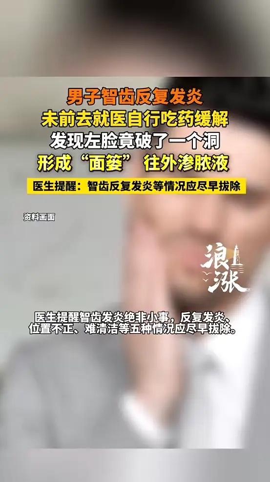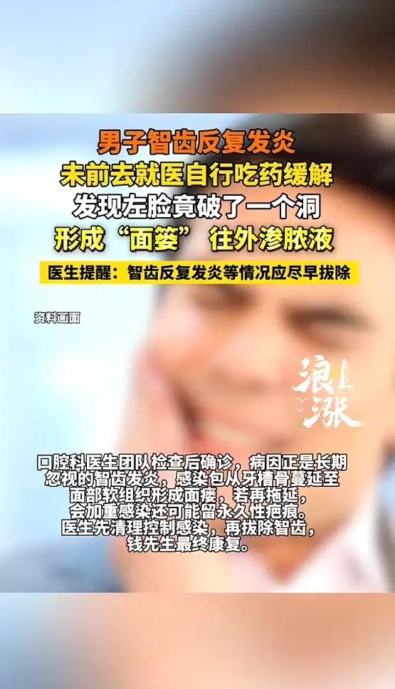“悲剧还是发生了!”浙江宁波,一男子智齿反复发炎数年,他却始终觉得是小毛病,疼的时候就靠吃药缓解,结果前段时间,男子发现自己左侧面部破了个洞,还一个劲往外渗脓液,去医院一看,才知道正是反复发炎的智齿引起的!网友:心真大! 钱先生这颗智齿,已经闹腾了好几年。每次疼起来,半边脸都肿着,吃饭说话都费劲。他觉得牙疼不算病,忍忍就过去了。实在受不了,就去药店买点消炎药,吃几天压下去。反反复复,成了家常便饭。 他总想着,拔牙多疼啊,能拖一天是一天。消炎药成了他的“救命稻草”,以为把表面的肿痛消下去就万事大吉。炎症的根子,其实一直埋在牙床深处,悄悄蔓延。 那天洗脸手指摸到左脸颊有个小硬块,他以为是上火长的痘。没过几天硬块变软了,皮肤颜色越来越深,最后破了个小口。脓液顺着那个小洞不停地往外渗,擦干净了又流出来。钱先生这才慌了神,他怕这张脸就这么毁了,整天胡思乱想,觉都睡不好,思来想去走进了宁波市中西医结合医院口腔科。 接诊的孙科家医生发现这是典型的“面颊瘘”,医学上叫牙源性面部皮肤瘘。根源就是那颗被长期忽视的智齿。反复的炎症从牙根侵蚀到牙槽骨,再穿透面部软组织,最后在皮肤上破了一个洞。 智齿位置靠后,刷牙很难清洁到位,食物残渣塞在牙龈和牙冠之间的“盲袋”里,细菌大量繁殖,就会引发冠周炎。如果只是吃药压症状,不解决根本问题,感染就会沿着组织间隙扩散,形成脓肿。压力大到一定程度,脓液就得找地方出去,于是穿透皮肤,形成瘘管。 治疗先要彻底清理他面部的深部感染灶,把坏死的组织一点点刮除干净,反复冲洗引流,控制住感染。等伤口慢慢愈合,炎症完全消退,才能把那颗“罪魁祸首”智齿连根拔除,从源头上解决问题。 钱先生经过精心治疗,他脸上的洞最终愈合了,没留下疤痕。很多人的智齿长得歪歪扭扭,或者只露出一半,这种“阻生智齿”最容易藏污纳垢,引发反复炎症。 智齿发炎真不是“上火”那么简单,感染一旦向深处扩散,可能引起颌面部间隙感染,甚至危及生命。等到脸上烂个洞再治,不仅人遭罪治疗也麻烦。 身体出现问题不能总靠“忍”和“拖”来应付,小毛病拖着拖着,就可能拖成大麻烦。尤其是口腔问题,和全身健康息息相关。 对待智齿该拔就得拔,特别是那些反复发炎出问题的,越早处理越好。别等到脸被“穿洞”,才后悔莫及。定期看牙医,发现问题及时处理,才是对自己真正的负责。 各位读者你们怎么看?欢迎在评论区讨论。