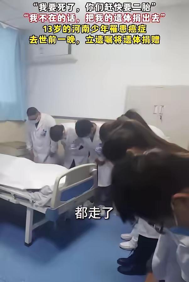 “我要死了,你们赶快生二胎。”河南郑州,13岁男孩患癌晚期,绝食逼父母生二胎,临终遗言更是让全场泪目,网友:这孩子是天使! 这孩子叫佑佑,河南郑州一个普通农村家庭的孩子。 佑佑的父母都是老实巴交的农民,一辈子靠种地和打零工过日子,家里条件本就不宽裕。为了给佑佑治病,夫妻俩把能借的亲戚都借遍了,前后花了二十多万,不仅掏空了家底,还背上了沉甸甸的外债。 佑佑刚确诊的时候,才12岁多,正是该在校园里跑跳、和同学打闹的年纪,却只能躺在病床上,承受化疗带来的痛苦。 呕吐、脱发、浑身无力,这些成年人都扛不住的折磨,佑佑咬着牙扛了下来,从来没在父母面前喊过一声疼,就怕父母跟着心疼。他还总反过来安慰爸妈,说自己没事,让爸妈别担心,好好吃饭,别累坏了身体。 后来病情越来越重,医生也悄悄告诉父母,孩子的情况已经到了晚期,治愈的希望渺茫,继续治疗只会增加孩子的痛苦,也只会让家里的债越背越重。 佑佑是个心思通透的孩子,他从父母日渐憔悴的脸、医生欲言又止的眼神里,早就明白了自己的处境。他知道,自己每多撑一天,父母就要多花一天的钱,多受一天的罪。他看着爸妈每天为了凑医药费,四处奔波,头发白了一大半,人也瘦了一圈,心里比自己生病还疼。 从那天起,佑佑开始绝食,不管父母怎么劝,医生怎么开导,他都一口饭不吃,一口药不碰。 主治医生王刚忍不住批评了他,可孩子只是低着头,一言不发,眼里全是和年龄不符的沉静。直到父母哭着跪在病床前,求他吃东西,佑佑才开口,说出了那句让所有人心碎的话:“我要死了,你们赶快生二胎。” 佑佑说,自己走了之后,爸妈就没人养老了,再生一个孩子,以后爸妈老了,身边能有个照应,不至于孤孤单单。他还说,自己已经花了家里太多钱,不想再拖累爸妈,绝食就是不想再让爸妈为自己花钱,不想让爸妈人财两空。 父母听完,当场崩溃大哭,他们怎么也想不到,13岁的孩子,在生命的最后时刻,心里装的全是爸妈,全是这个家,唯独没有他自己。夫妻俩抱着孩子,哭到浑身发抖,他们宁愿自己苦一辈子,也不愿意放弃孩子,可孩子的懂事,却让他们连劝的话都说不出口。 生命进入倒计时的最后一晚,佑佑把父母和医生都叫到了病床前,用尽最后一丝力气,说出了第二个遗愿。 他说,自己走了之后,把遗体捐给医院,让医生拿去研究癌症。他说,自己已经受了这么多苦,不想再让别的孩子,别的家庭,再受和他一样的罪。万一医生能从他身上找到治疗癌症的办法,那他的死,就不算白死。 在场的医生护士,听完这句话,全都红了眼眶。 主治医生王刚说,从医这么多年,见过太多生离死别,可像佑佑这么懂事、这么善良的孩子,还是第一次见。一个13岁的孩子,在生命的最后时刻,没有抱怨,没有哭闹,心里想的全是父母,全是素不相识的陌生人,这份大爱,让所有人都为之动容。 第二天清晨,佑佑在父母的陪伴下,平静地离开了这个世界。 按照他的遗愿,父母含泪签署了遗体捐献同意书,把孩子的遗体捐给了郑州市第三人民医院,用于癌症研究。医院的全体医护人员,自发来到病房,对着佑佑的遗体,深深鞠了一躬,送别这个善良的小天使。 这件事传到网上,瞬间看哭了无数网友。大家都说,佑佑是天使,来人间一趟,受尽了苦难,却把所有的温柔和善良,都留给了这个世界。很多人说,自己活了几十年,都不如一个13岁的孩子通透,不如一个孩子有大爱。 其实佑佑的懂事,从来都不是天生的。是父母的爱,教会了他爱别人;是生活的苦,让他早早学会了体谅别人。他知道父母的不容易,知道父母的付出,所以在生命的最后,用自己的方式,回报父母,回报这个世界。 很多人说,生二胎是为了给孩子留个伴,可佑佑主动劝父母生二胎,不是为了自己,是为了父母的晚年。他怕自己走后,父母孤苦无依,怕父母老了没人照顾,这份心思,细腻到让人心疼。 很多人说,遗体捐献是成年人的选择,需要巨大的勇气,可13岁的佑佑,却主动提出了这个要求。 他自己饱受癌症的折磨,深知这种病痛带来的绝望,所以他愿意用自己最后的力量,为医学研究添一份力,为无数和他一样的癌症患儿,留下生的希望。 佑佑走后,父母沉浸在巨大的悲痛里,可他们也记住了孩子的遗愿。他们说,会好好生活,会按照孩子的心愿,好好过日子,也会永远记住孩子的善良,把孩子的爱,延续下去。 这个13岁的少年,用自己短暂的一生,诠释了什么是善良,什么是担当,什么是大爱。他的生命虽然短暂,却照亮了无数人的内心,也给这个世界,留下了最温暖的感动。 各位读者你们怎么看?欢迎在评论区讨论。