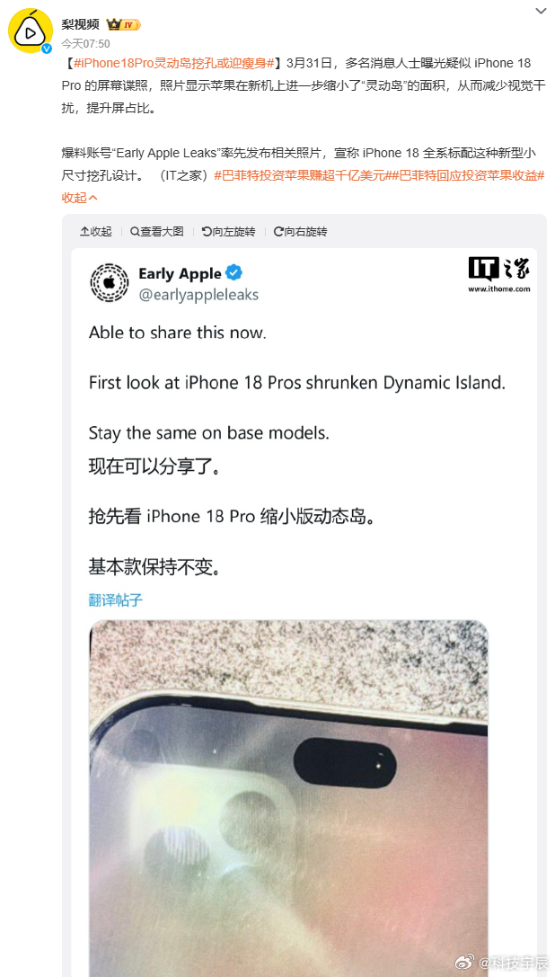 刷到条消息,iPhone 18 Pro的灵动岛要瘦身了,说是谍照已经流出来,面积