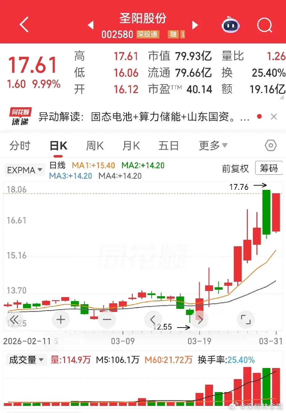 圣阳股份这波走得确实够凶悍,昨天高开长阴暴力洗盘,打板客被震得难受,今天又冲高回