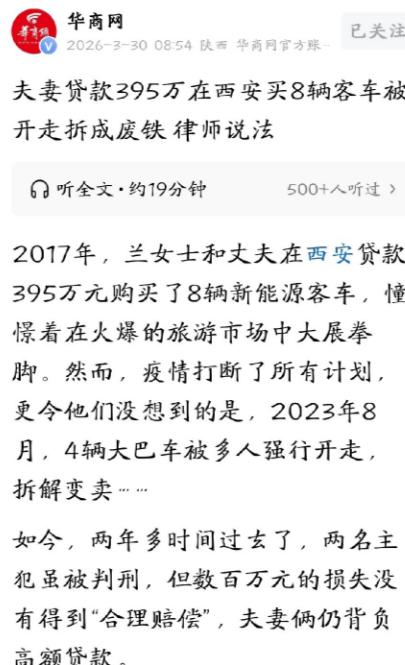 太难了!陕西西安,夫妻二人花568万买了8辆客车,准备在旅游市场上大赚一笔,其中395万是从银行和担保公司贷的款。谁知,疫情突然来袭,旅游行业按了暂停键,两口子也没了收入,贷款也还不上了。随后,法院将8辆车查封,但没扣车,允许他们继续经营还贷。万万没想到,一天晚上,其中4辆竟被担保公司的人强行开走,以28万的价钱拆解卖了废铁。夫妻俩急了,赶紧告上法庭,法院的判决让两人无法接受。 一张28万元的电子收款凭证,看似普通,其背后却是一场让人心凉的生意惨案。 可这钱,并不是买二手车的尾款,而是8辆原本能日进斗金的大巴车,被拆成废铁后的残值。 故事发生在2017年的西安。那时候旅游生意火得一塌糊涂,街头巷尾都是招租旅游大巴的广告。 兰女士和丈夫眼睛都亮了——机会就在眼前,他们决定押上全部家产,抓住这块“金山”。 2018年他们气势汹汹,一口气买了8辆大型新能源客车,每辆71万多。 家里资金不够,只好东拼西凑:银行贷款、担保公司借款,硬生生扛下395万债务,那会儿谁怕欠钱啊,车开上路,每天都有现金流进账,兰女士连梦里都在数钱。 可好景不长,2020年疫情来了,旅游市场瞬间冻结,原本生金蛋的大巴,停在停车场里,反而成了吞钱怪兽。 资金链断裂,395万贷款开始大面积逾期,银行在天灾面前还算通融,允许延期还款,但担保公司却毫不手软,把之前扣下的保证金死死扣住,不肯帮忙减轻月供。 双方闹上法庭。兰女士没想到,当她和担保公司硬杠时,一颗毁灭性的炸弹已经埋进了车队里,2021年,法院查封了8辆车。 但这是“活封”,意思是车归你保管,你还能开着挣钱还债,法律本意是给债务人留一条自救的生路。 可担保公司偏不按规则走,2023年春,旅游市场回暖,车又快能上路赚钱了,8月8日深夜,担保公司派出几十号人,趁夜破开停车场大门,把4辆已经查封的大巴开走。 整整28个小时后,这几辆价值数百万的新车,在废旧金属站被切割成废铜烂铁,结算单上只值28万,剩下4辆车也没能幸免,被同样处理掉。 这就是零和博弈的残酷——你刚要翻身,我就把你的翻身工具砸掉。 28万换走的,不仅是几辆车,更是你未来可能赚到的钱,法律条文明明规定,查封物不能擅自处置,但他们根本不在乎,明知违法,硬干到底,结果自食恶果。 2025年11月,郭某和担保公司头目谢某因为非法处置查封财产罪,被抓进了牢里。 刑事上算是给了正义一记重拳,但民事赔偿上,兰女士却彻底心凉,法院评估时,只按现有二手车折旧价算了3辆车,总赔偿60万,平均一辆20万。 她手里的账本明明算得清清楚楚:买车贷款利息上百万,市场回暖后本可以赚的利润更是可观,可法院说,“预期利润缺乏确凿证据”,不予支持。 这个落差太扎心了:车没了,债务还在;凶手被抓,赔偿却微乎其微,法律承认你曾经受害,却无法完全帮你补回未来可能赚的钱。 兰女士和丈夫,成为了最凄惨的负资产家庭,395万债务像吸血鬼一样,继续吞噬家里最后一滴血,而能拿回的赔偿,只能填填牙缝。 兰女士咬紧牙关,决定把民事赔偿打到底,她清楚,如果“活封”这种善意规则,都能被野蛮手段踩在脚下,那么不仅她一家,整个在风浪中艰难支撑的小微家庭,都可能面临同样的绝境。 这个故事告诉我们,生意有风险,但更可怕的是规则被践踏的无力感,你看似有救命工具,可一旦被强行夺走,再多正义判决,也难弥补失去的机会和时间。