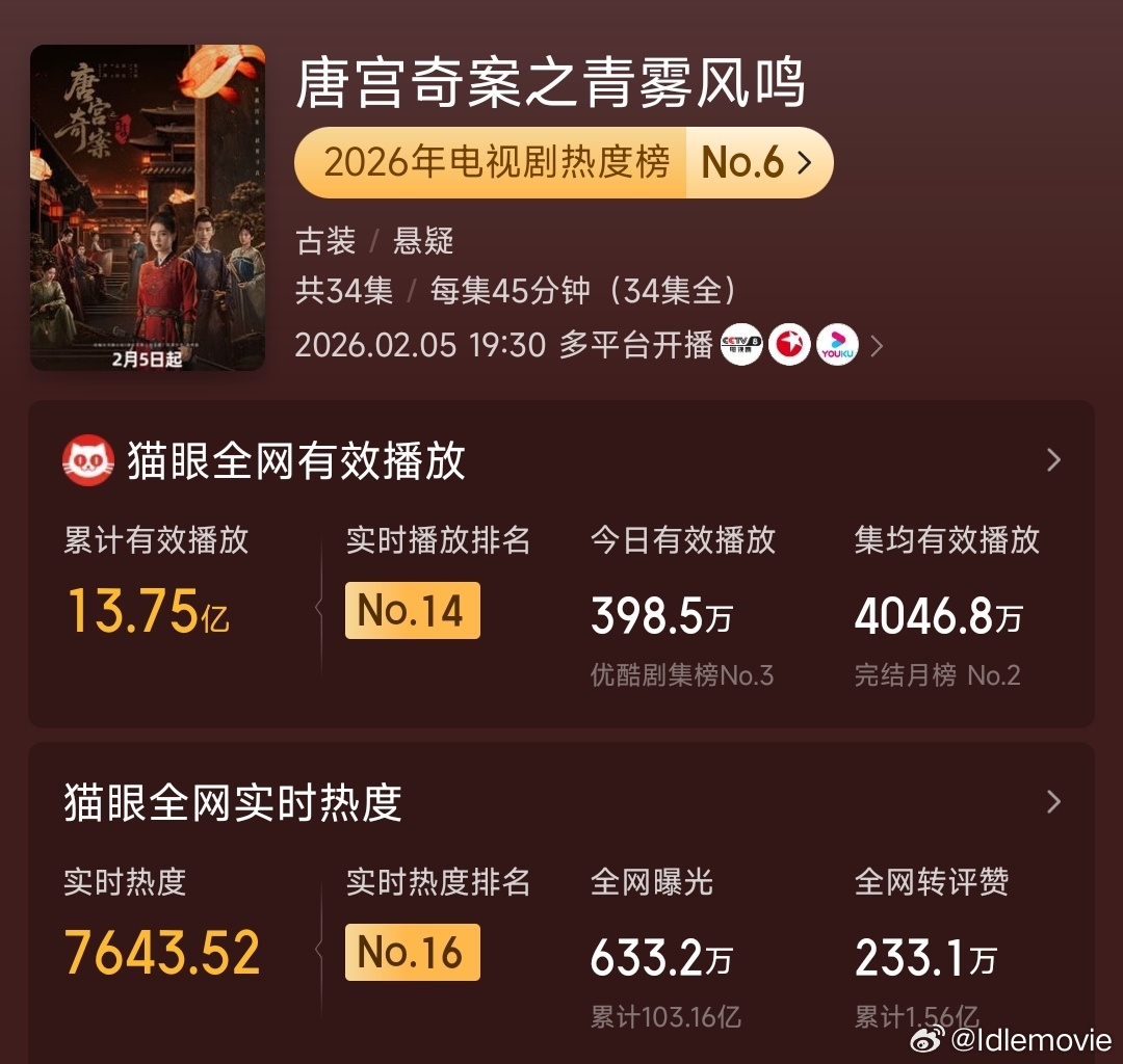 《唐宫奇案》年初热播,打破女本位探案的格局,创造长剧新可能,各项数据也在稳步提升中,有效播放13.75亿,集均4046.8万,全网曝光633.2,已经不是长尾了,而是爆尾。