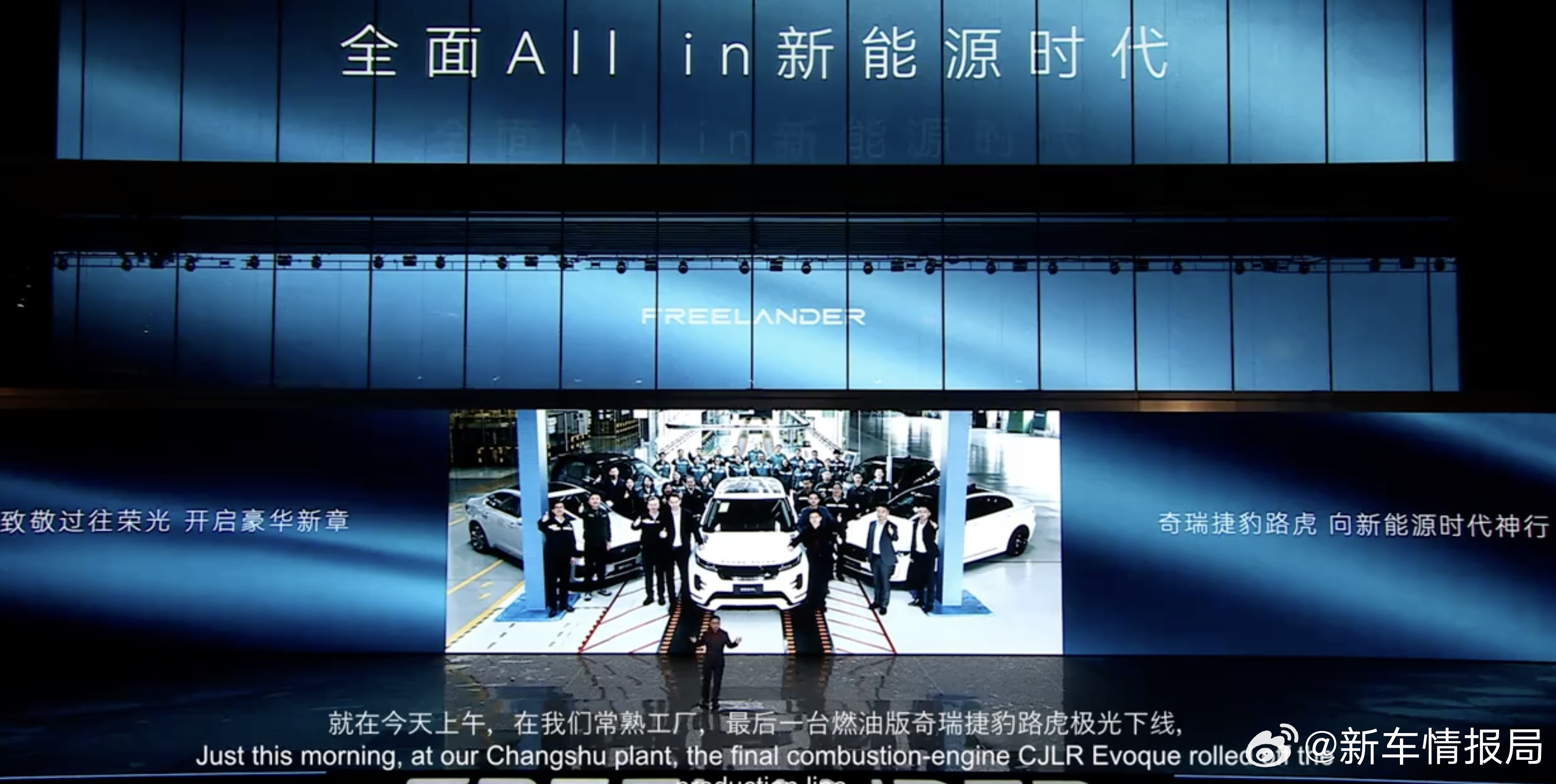 最后一台国产揽胜极光下线奇瑞捷豹路虎工厂已All in新能源在FREELANDER神行者品牌发布会上,FREELANDER神行者全球CEO 文飞称,奇瑞捷豹路虎工厂最后一台揽胜极光已正式下线,标志着奇瑞捷豹路虎已经做好All in新能源的准备。