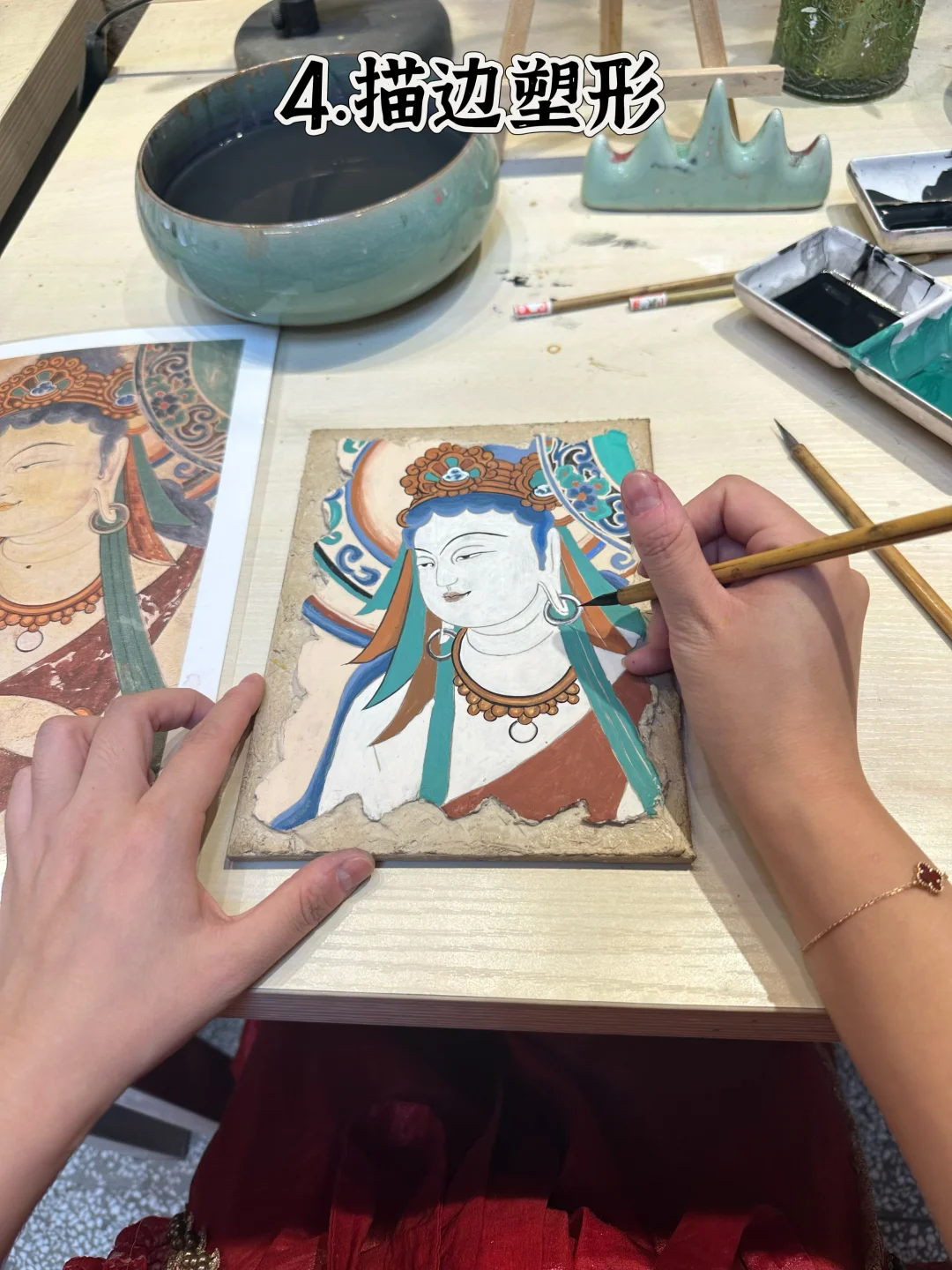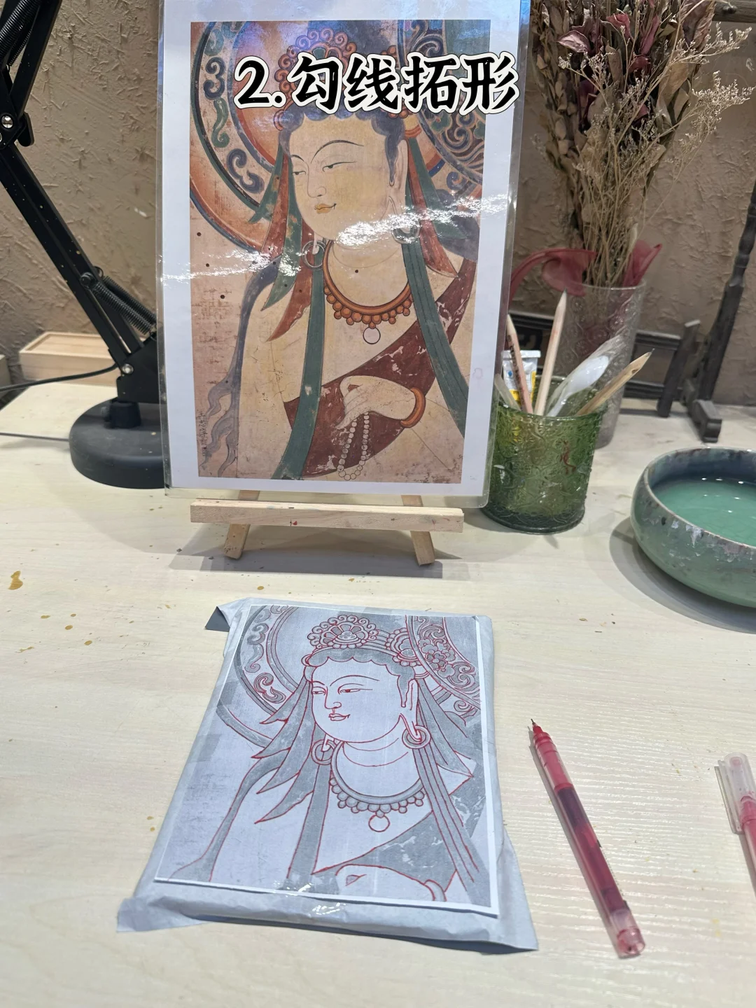 2️⃣勾线拓形:不用自己打草稿✏️,把选好的图案用复写纸拓在泥板上,稍微用点力就能出形,看着菩萨的轮廓慢慢显现,超有仪式感!✨