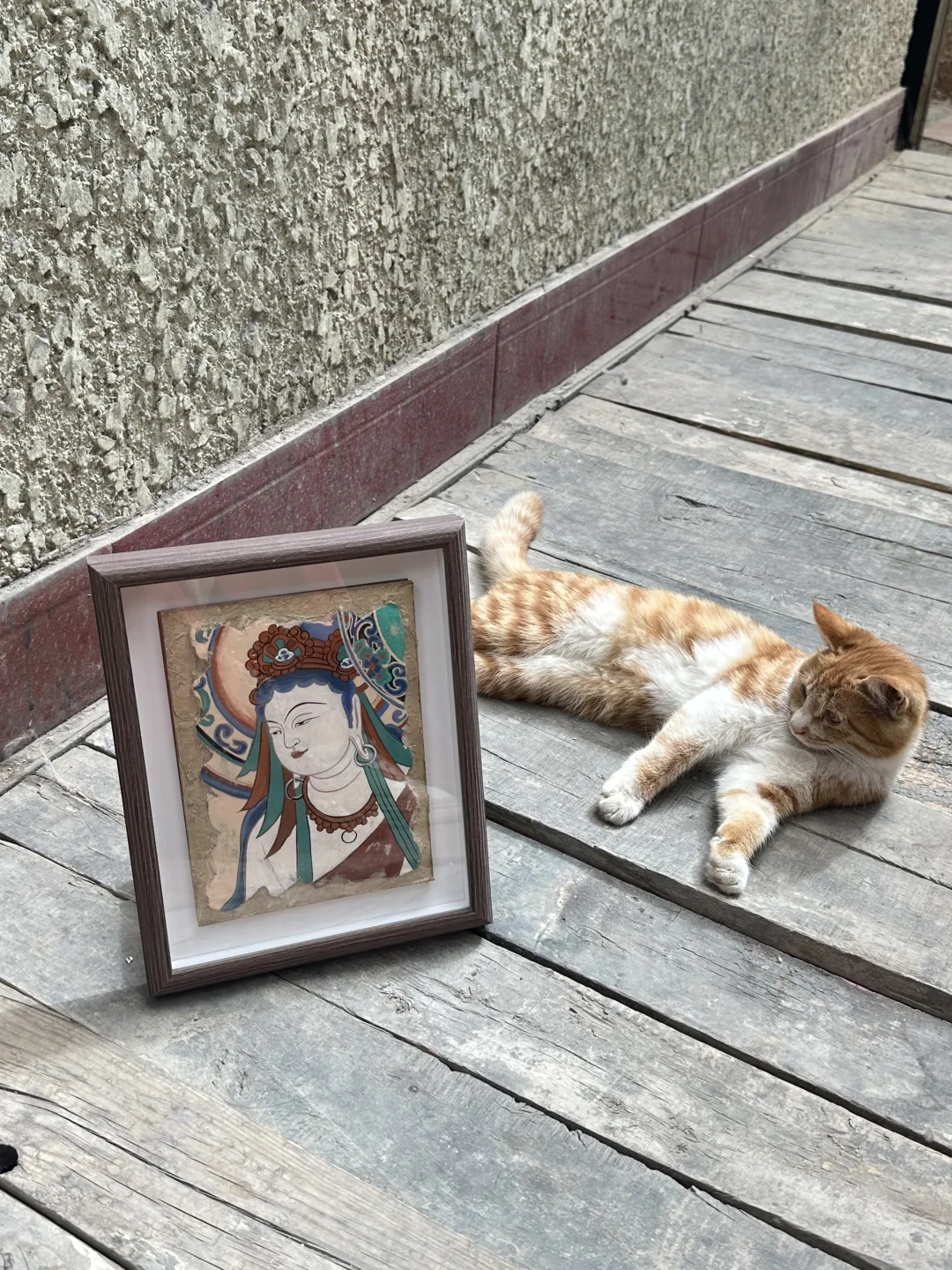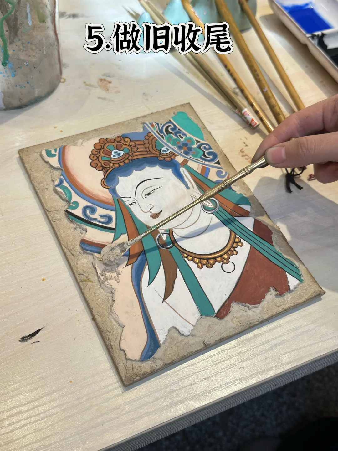 5️⃣做旧收尾:最后用敦煌土黄色颜料点涂🟡,干了之后轻轻磨砂,壁画瞬间有了岁月沉淀的质感,拿到手那一刻,感觉像捧了件“小文物”!🏺