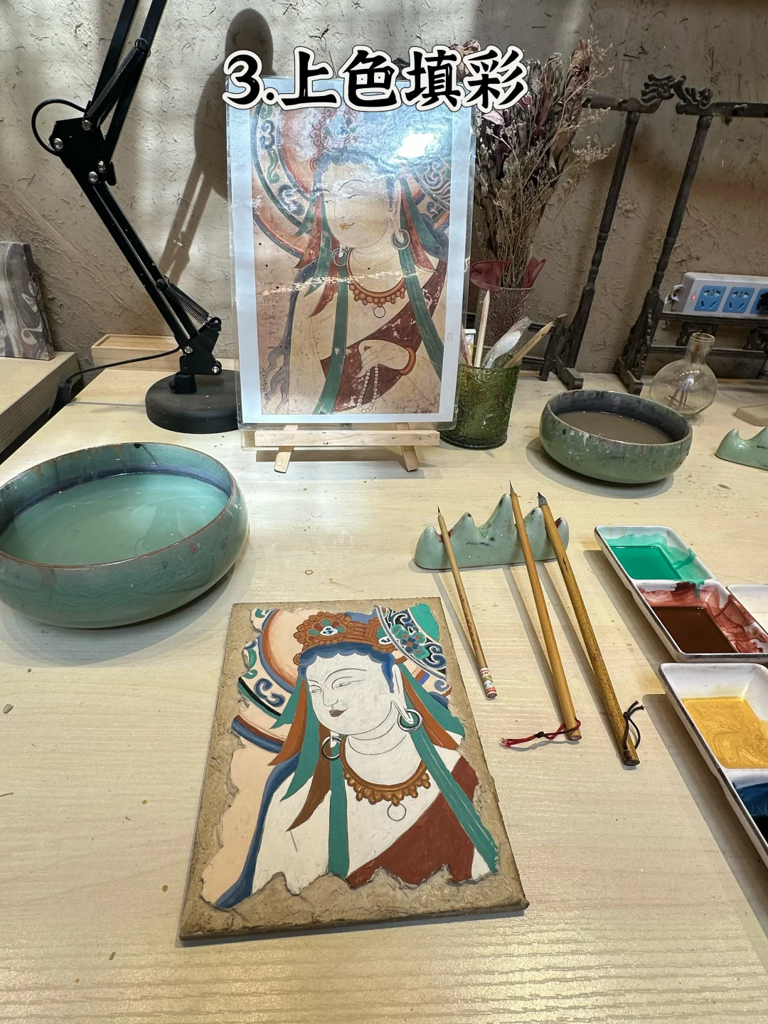 3️⃣上色填彩:小姐姐会按莫高窟原比例调颜料🎨,从衣褶的青蓝到璎珞的金红,配色自带千年古韵。我涂得超认真,生怕错过任何一个细节,不知不觉就沉浸进去了~😌