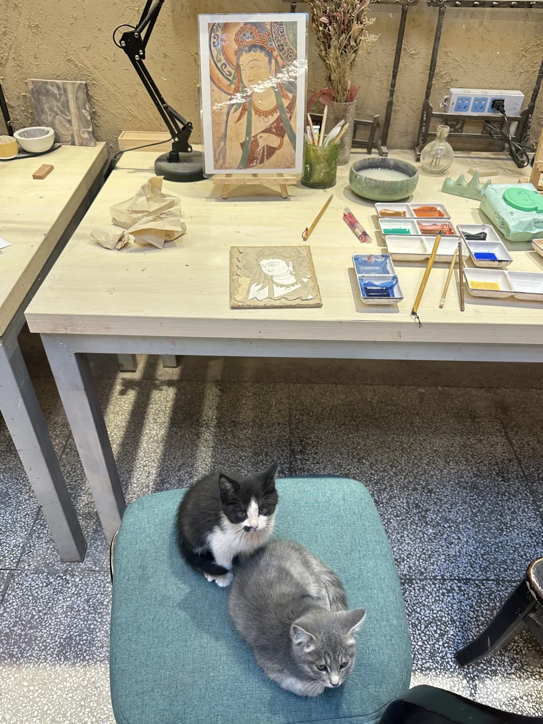• 萌宠陪伴:店里有3只软fufu的小猫🐱和2只温顺的狗狗🐶!画累了撸撸猫、逗逗狗,疲惫瞬间消失,氛围真的太治愈了~🥰