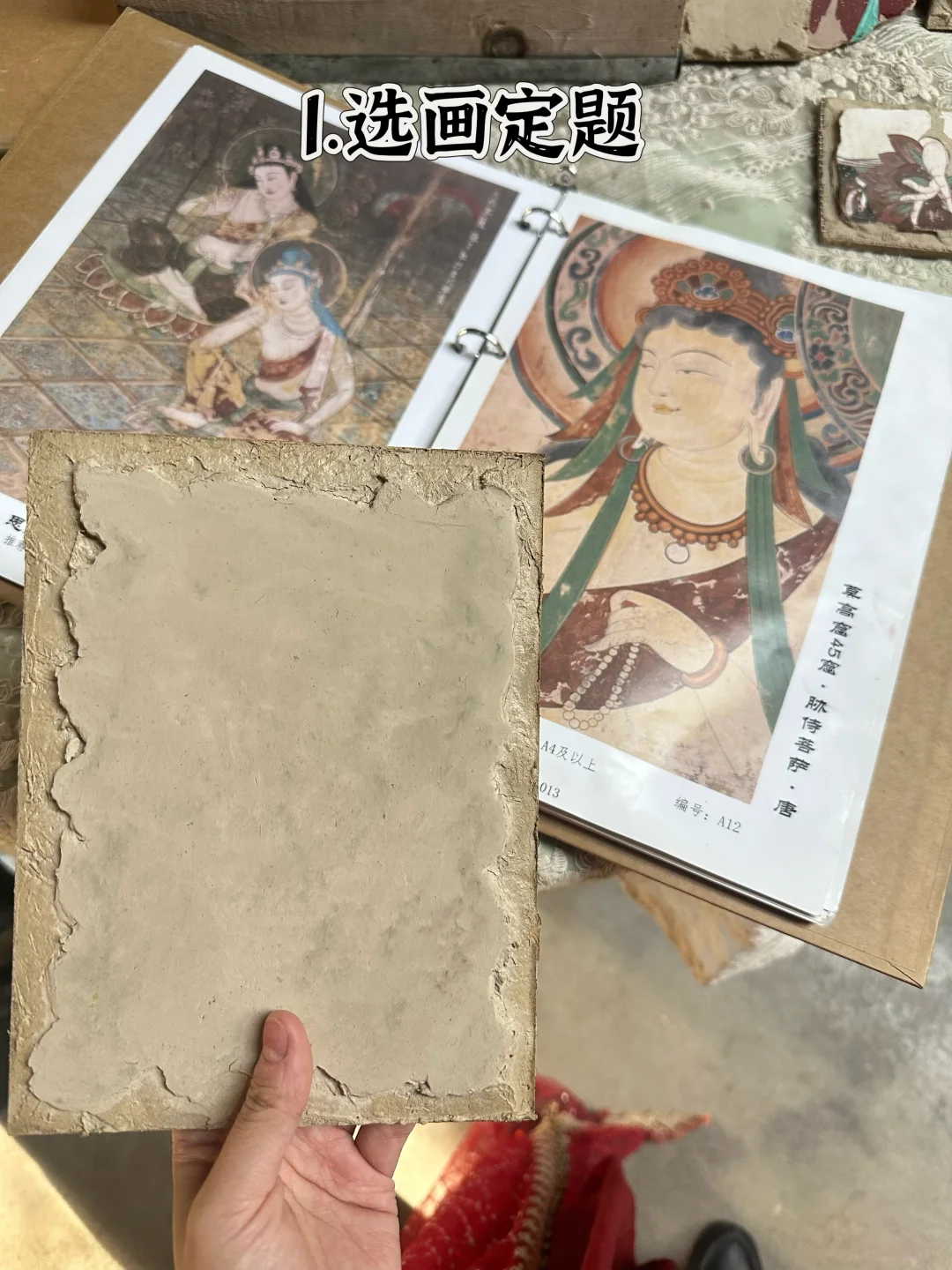 1️⃣选画定题:画册里全是莫高窟经典纹样📖,飞天、反弹琵琶都有,但我一眼选中了文殊菩萨!老板说这个图案细节美又不算太难,新手也能驾驭👍。